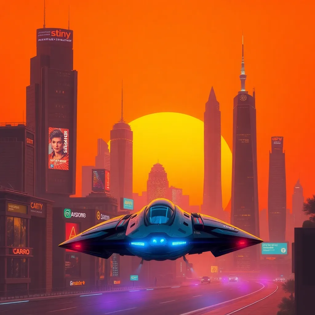 Create a futuristic cityscape at sunset, with a vibrant orange background color. The city's skyscrapers and buildings should be a blend of modern and retro styles, with neon lights and holographic advertisements glowing in the fading light. Incorporate a sleek, high-tech spacecraft landing in the foreground.