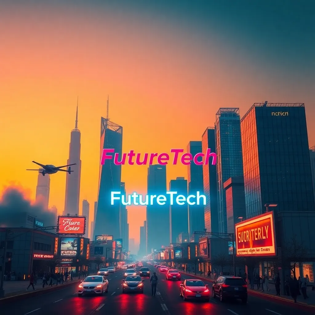 Create a futuristic cityscape at sunset with a warm orange background, featuring sleek skyscrapers, flying cars, and a giant neon-lit 'FutureTech' logo. Incorporate vibrant streetlights, bustling pedestrians, and a hint of smog in the air. Use a gradient effect to blend the orange background with a deep blue sky.