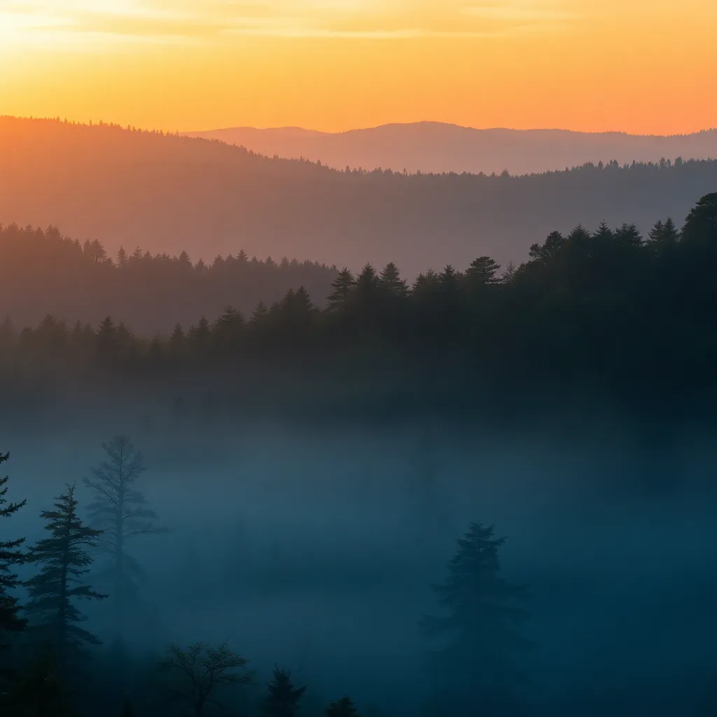 Create an image of a serene forest at sunset with a warm orange-yellow background. Replace the original background with a calming light blue hue. Keep the trees, rocks, and mist intact. Add a subtle gradient effect to blend the new background with the surrounding elements. Make the overall mood peaceful and dreamy.