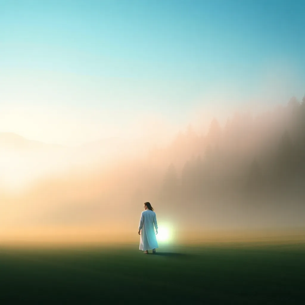 Create a surreal landscape with a misty forest in the background. Use a soft, gradient blue for the sky and a warm, golden light to illuminate the mist. In the foreground, include a lone figure in a flowing white robe, with a subtle glow surrounding them. The background color should be a gentle, muted green.