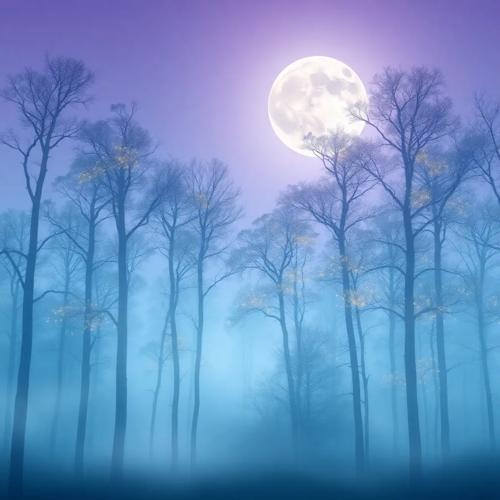 Create an ethereal landscape with a soft, gradient background. Imagine a serene moonlit forest, where tall trees with glowing leaves stretch towards a misty, lavender-hued sky. The atmosphere is mystical and peaceful, with a subtle glow emanating from the trees. Use a blend of blue and purple hues to capture this enchanting scene.