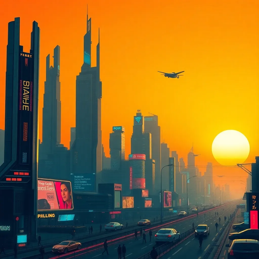 Create a futuristic cityscape at sunset, with a vibrant orange background that gradually transitions to a deep blue towards the horizon. Incorporate sleek skyscrapers, flying cars, and neon-lit billboards. The city should be bustling with activity, with people and robots going about their daily business.