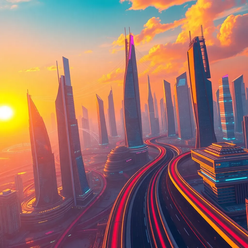 Create a futuristic cityscape at sunset with a warm, golden background. Incorporate sleek skyscrapers, winding roads, and a vibrant atmosphere. The dominant color palette should be shades of orange, yellow, and pink, with subtle hints of blue and purple. The image should exude a sense of energy and excitement.