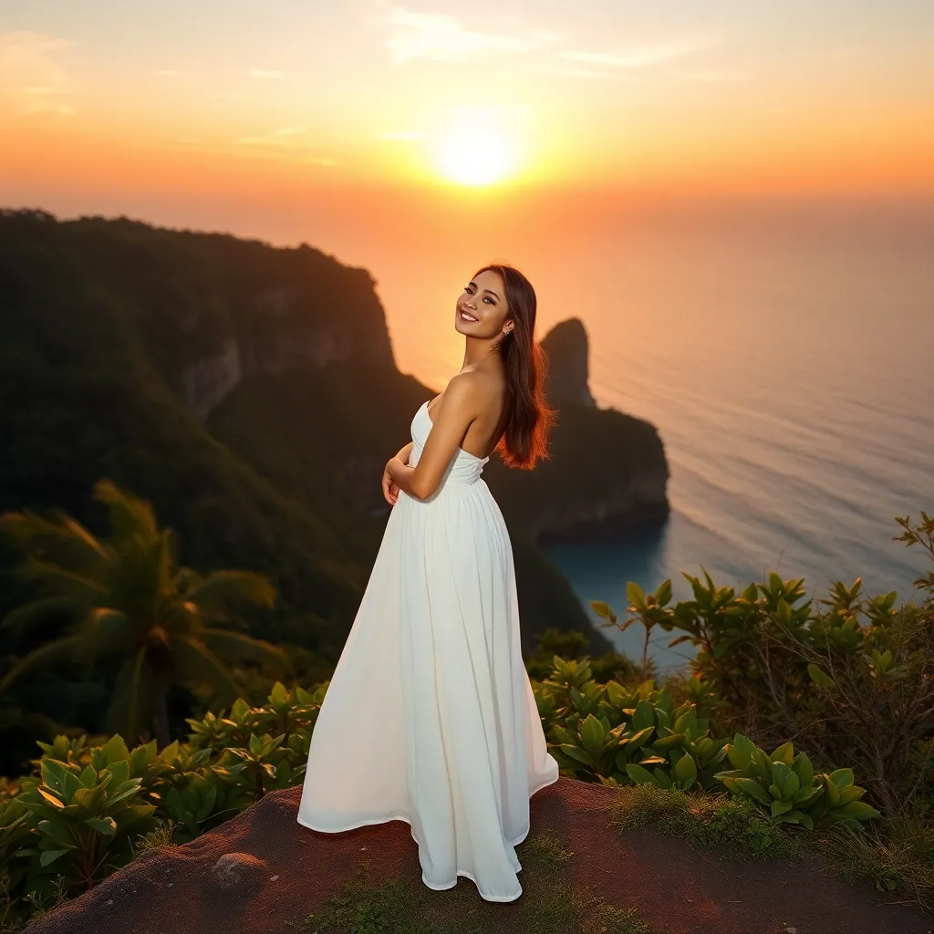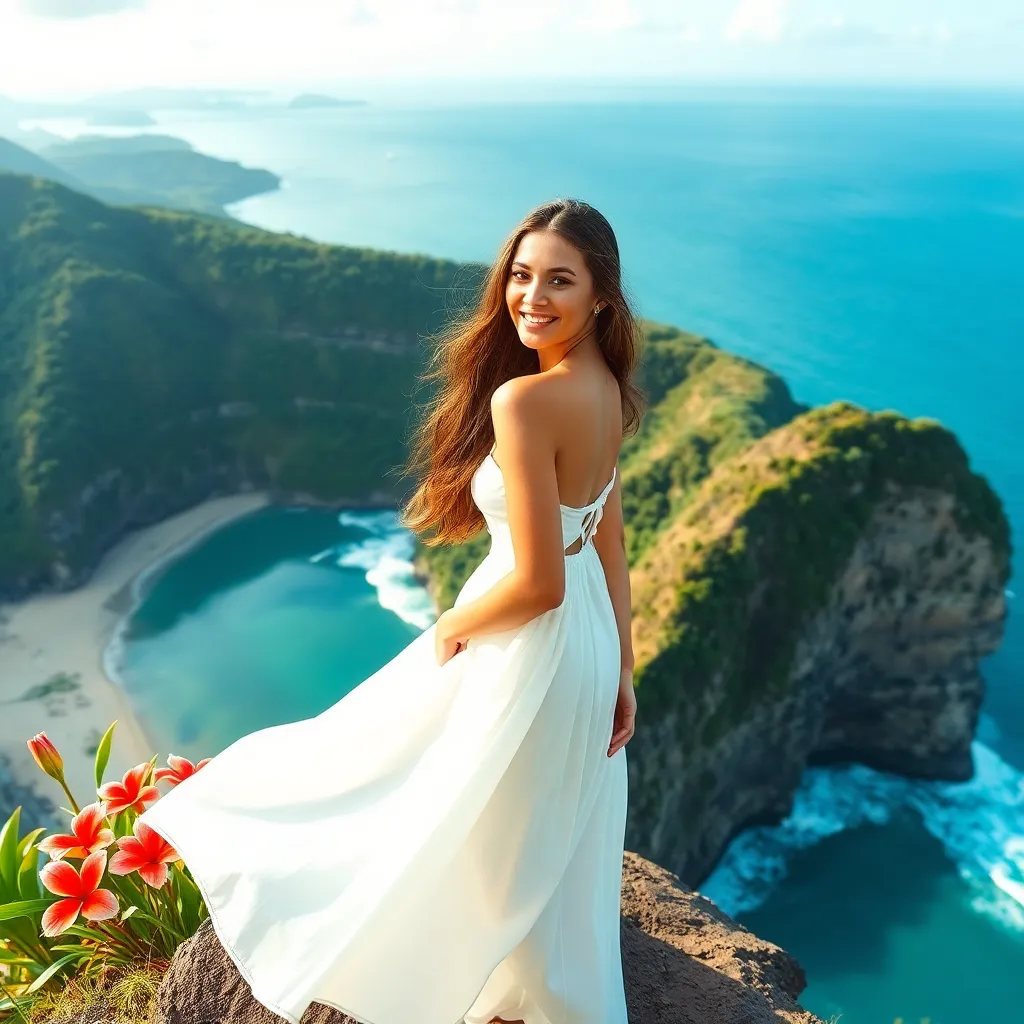 Capture the essence of Bali's sun-kissed beaches and lush green landscapes. Imagine a stunning influencer posing on a picturesque cliff overlooking the Indian Ocean, with a serene smile and a flowing white dress that billows in the gentle breeze. Incorporate vibrant tropical flowers and a warm golden light.