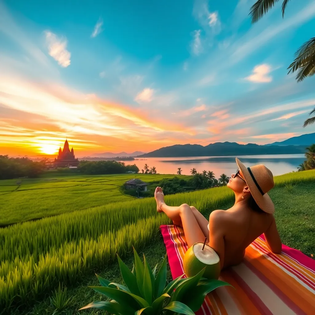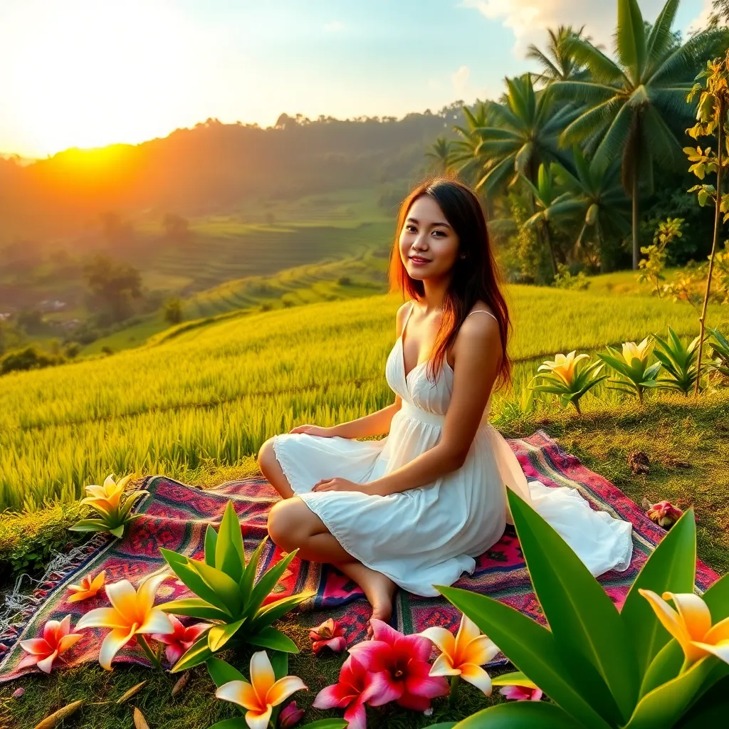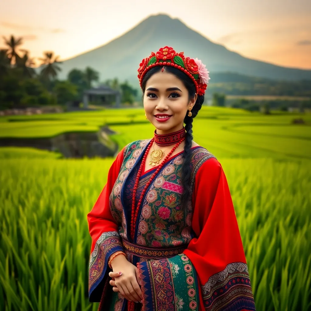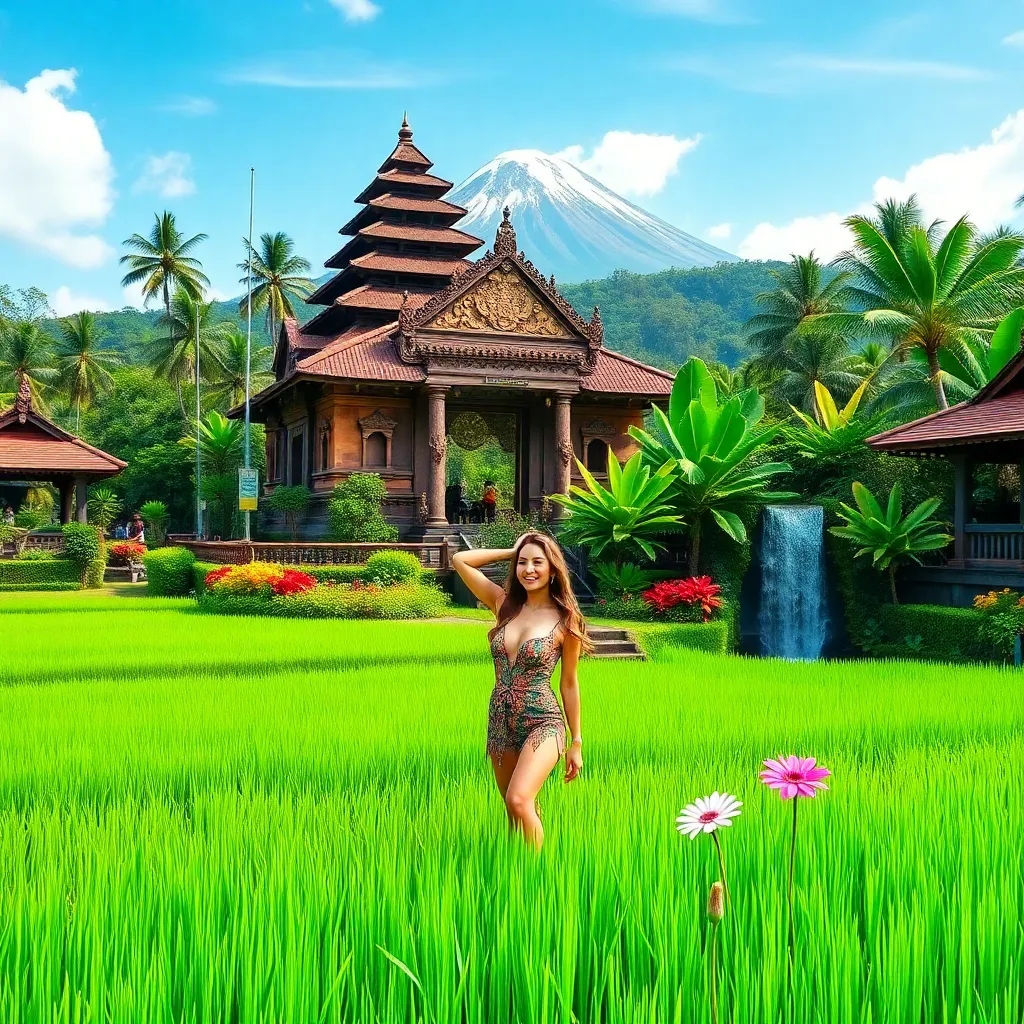 Capture the essence of Bali's serene beauty! Create an AI-generated image of a stunning Balinese influencer posing amidst lush green rice fields, with the majestic Mount Agung in the background. Incorporate vibrant colors, intricate traditional clothing, and a warm tropical glow to evoke feelings of relaxation and adventure.
