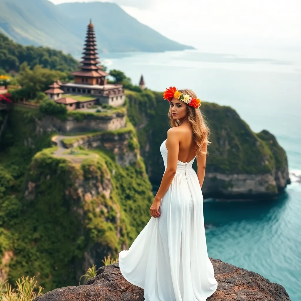 Capture the essence of Bali's tropical paradise! Imagine a stunning influencer standing on a cliff overlooking the crystal-clear waters of Uluwatu, with the iconic Balinese temples and lush greenery in the background. Dress her in a flowing white sundress and add a pop of color with a vibrant flower crown.