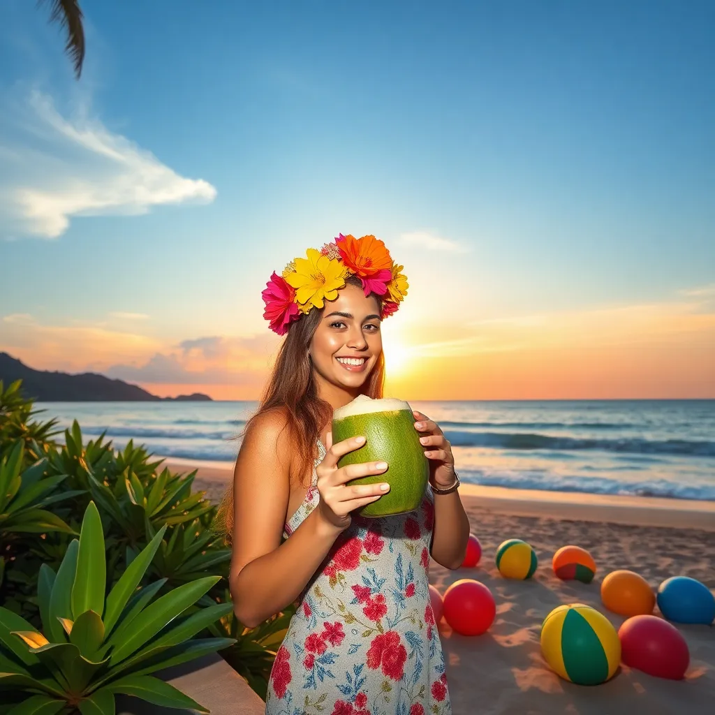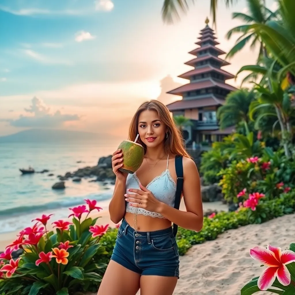Capture the essence of Bali's tropical paradise! Create an image of a stunning influencer posing on a sun-kissed beach, surrounded by lush greenery and vibrant flowers. Incorporate a trendy outfit, a refreshing coconut drink, and a stunning Balinese temple in the background. Share the serenity and beauty of Bali with your followers!