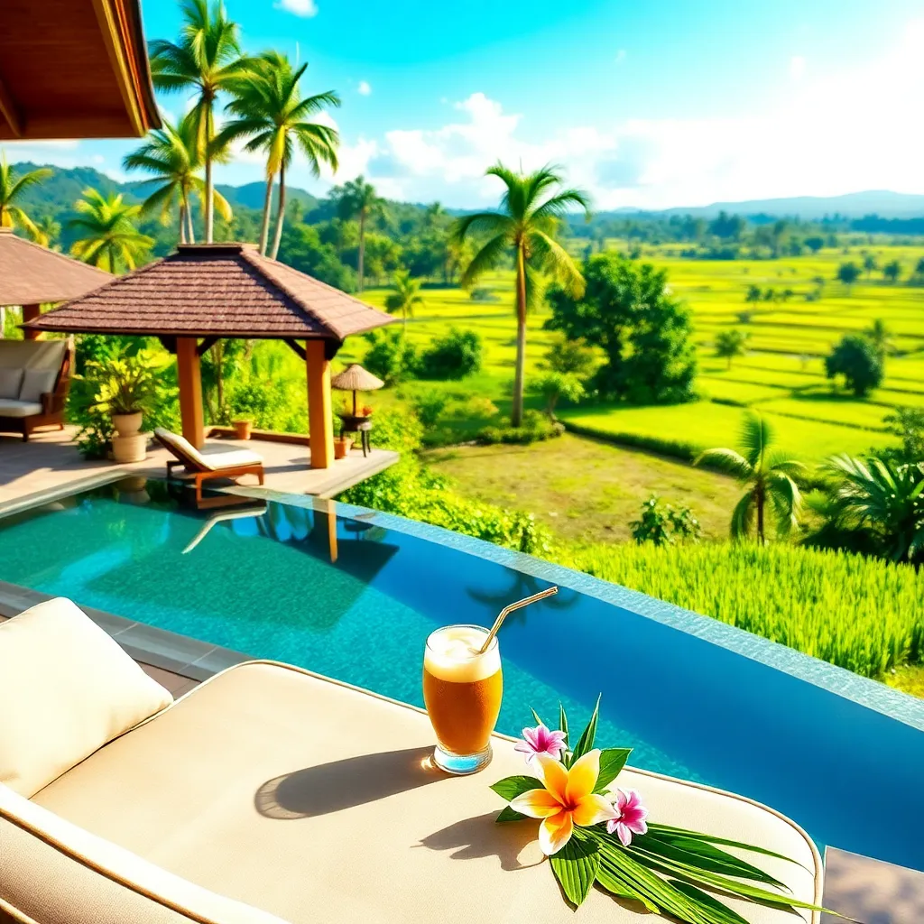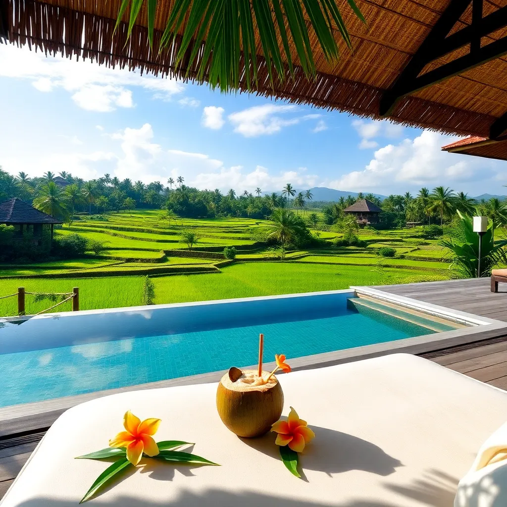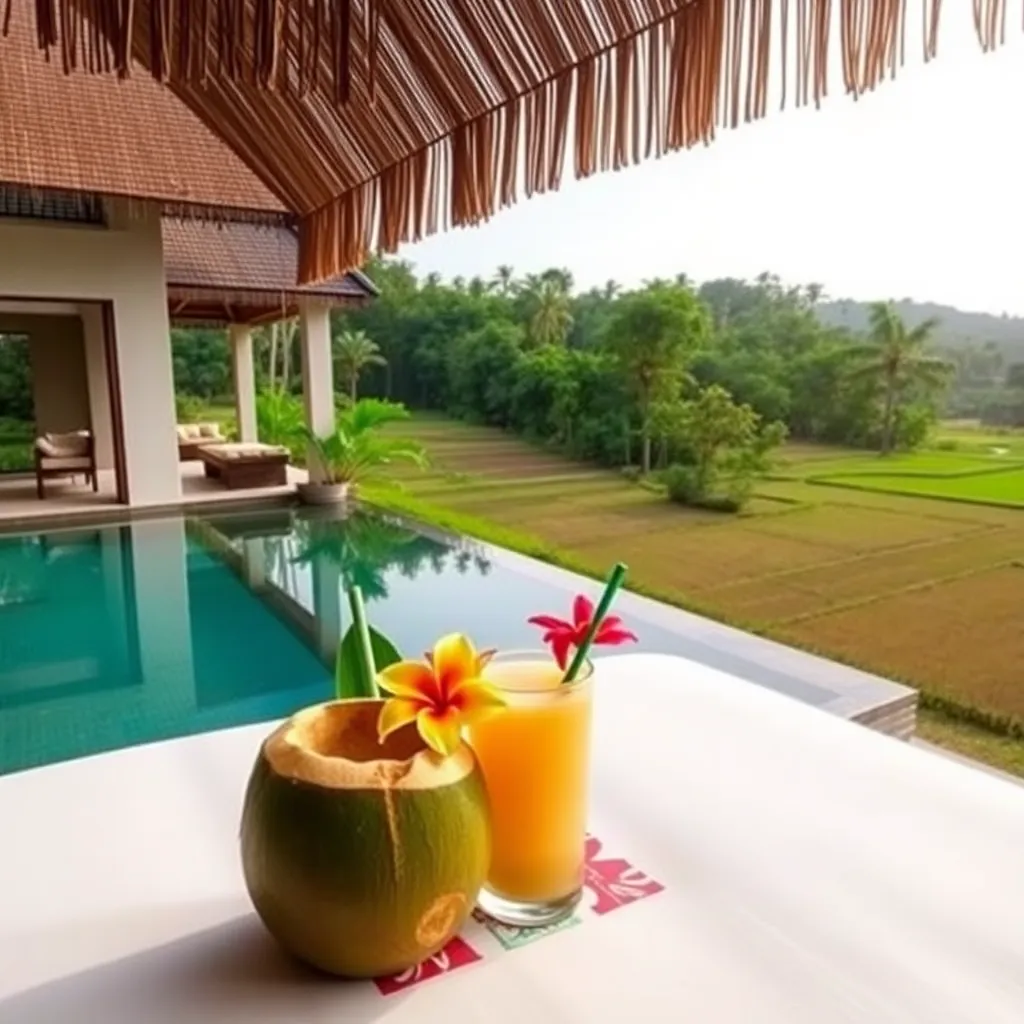 Capture the essence of Bali's tranquil beauty! Create an image of a stunning villa overlooking the rice fields, with a serene pool and lush greenery. Incorporate a comfortable daybed, a refreshing coconut drink, and a few strategically placed tropical flowers. The perfect setting for a relaxing getaway.