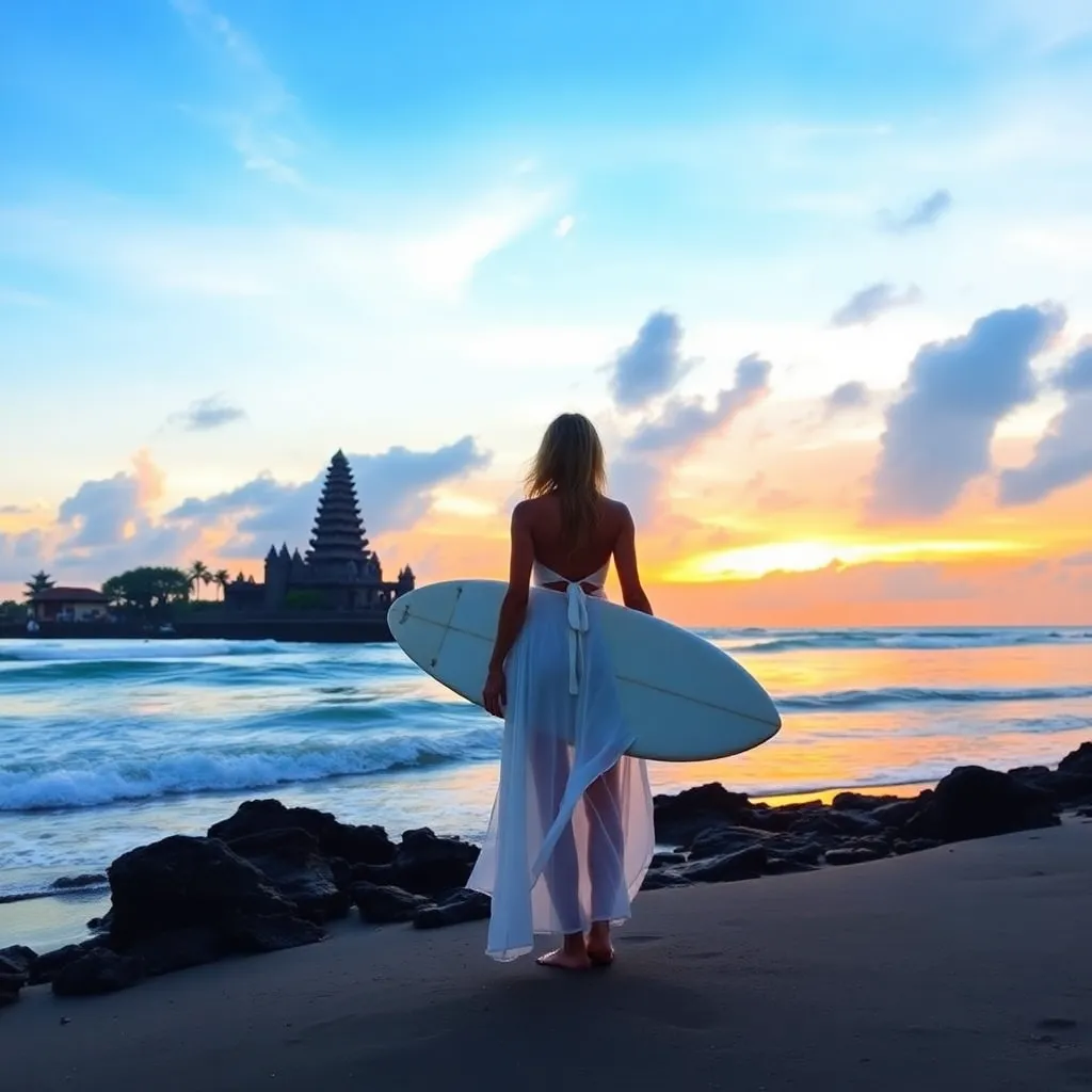 Capture the essence of Bali's serene beaches and lush green landscapes. Imagine a stunning influencer posing on the shores of Seminyak, with the iconic Uluwatu Temple in the distance. Surround her with vibrant tropical flowers, and capture the warm golden light of the setting sun. Create a breathtaking scene that screams 'Bali vibes'!