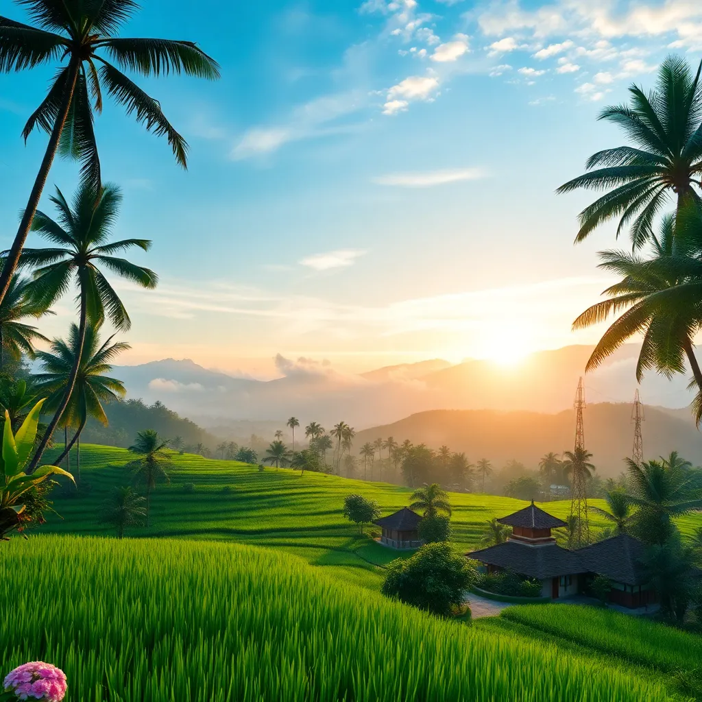 Capture the essence of Bali's tropical paradise in a stunning AI-generated image. Imagine a serene Ubud rice field at sunrise, with misty mountains in the background and a picturesque village in the foreground. Incorporate vibrant greenery, blooming flowers, and a warm golden light to evoke a sense of tranquility.