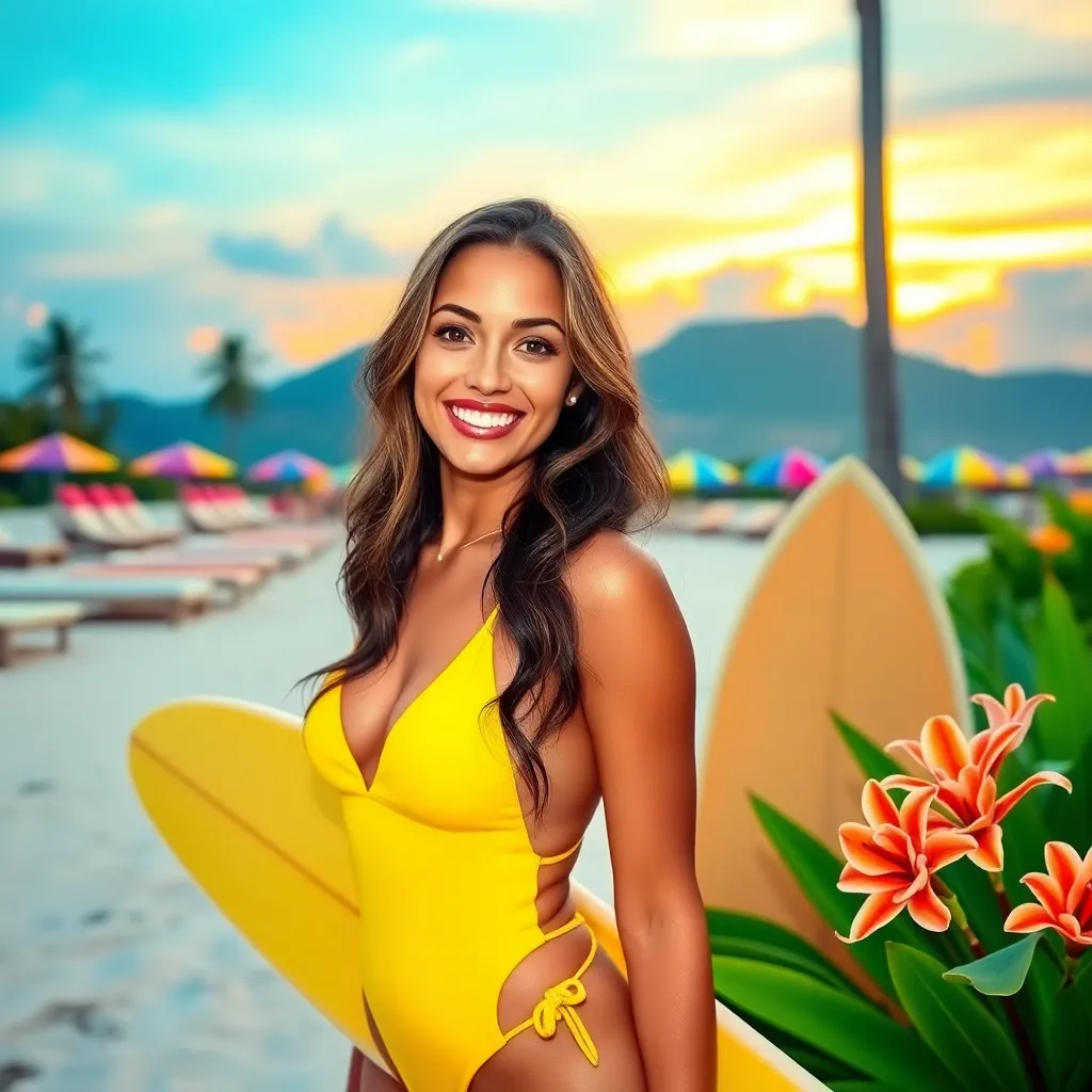 Capture the essence of Bali's tropical paradise! Imagine a stunning influencer posing on a pristine beach at sunset, surrounded by lush greenery and colorful beach umbrellas. The influencer is dressed in a vibrant yellow swimsuit and has a warm smile, with a surfboard and tropical flowers in the background.