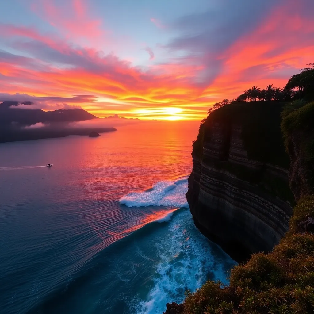 Capture the essence of Bali's tropical paradise! Create an image of a stunning sunset over Uluwatu's cliffside, with a lone surfer riding the waves below. Incorporate vibrant colors, misty mountains, and a serene atmosphere. Use a mix of real and surreal elements to transport viewers to this dreamy destination.
