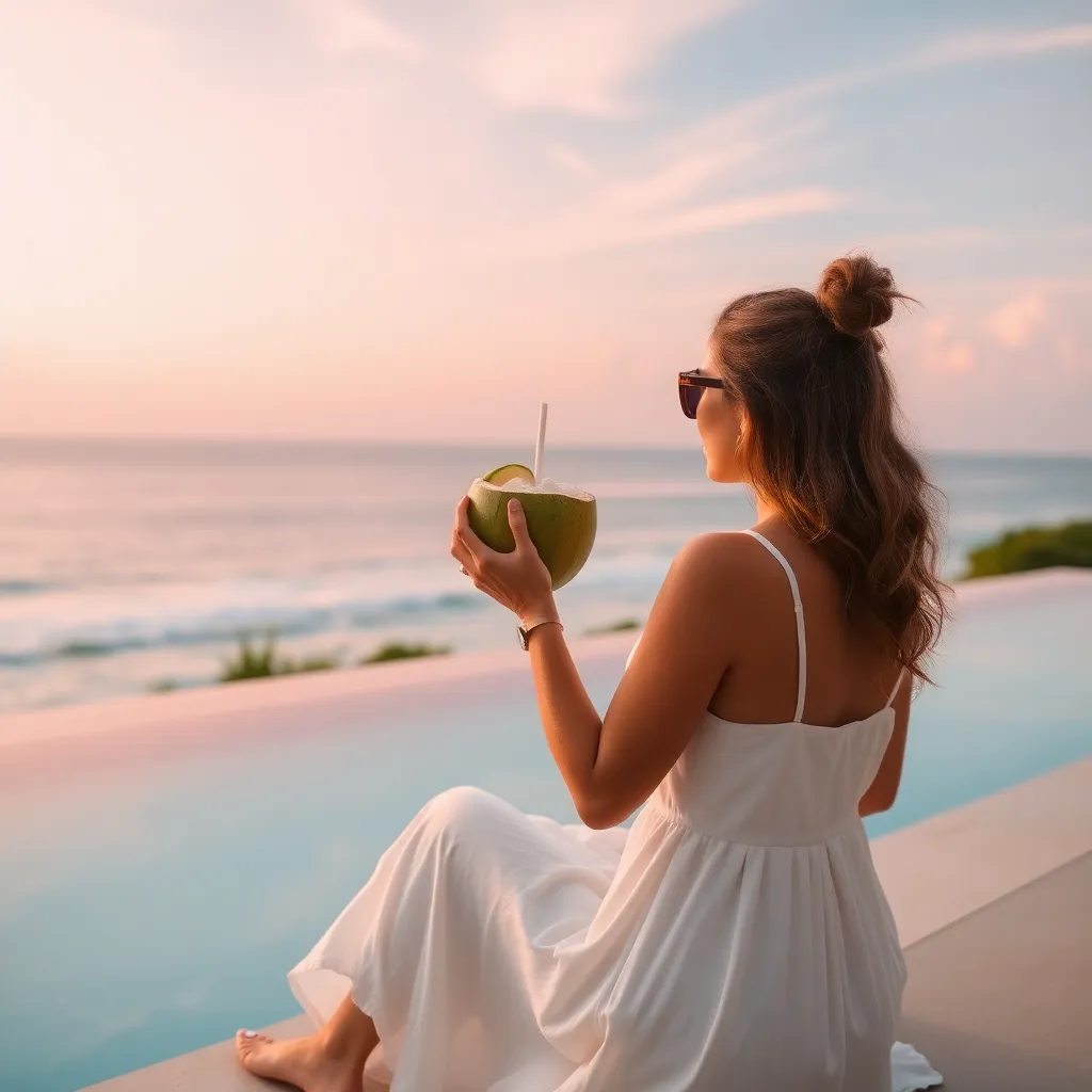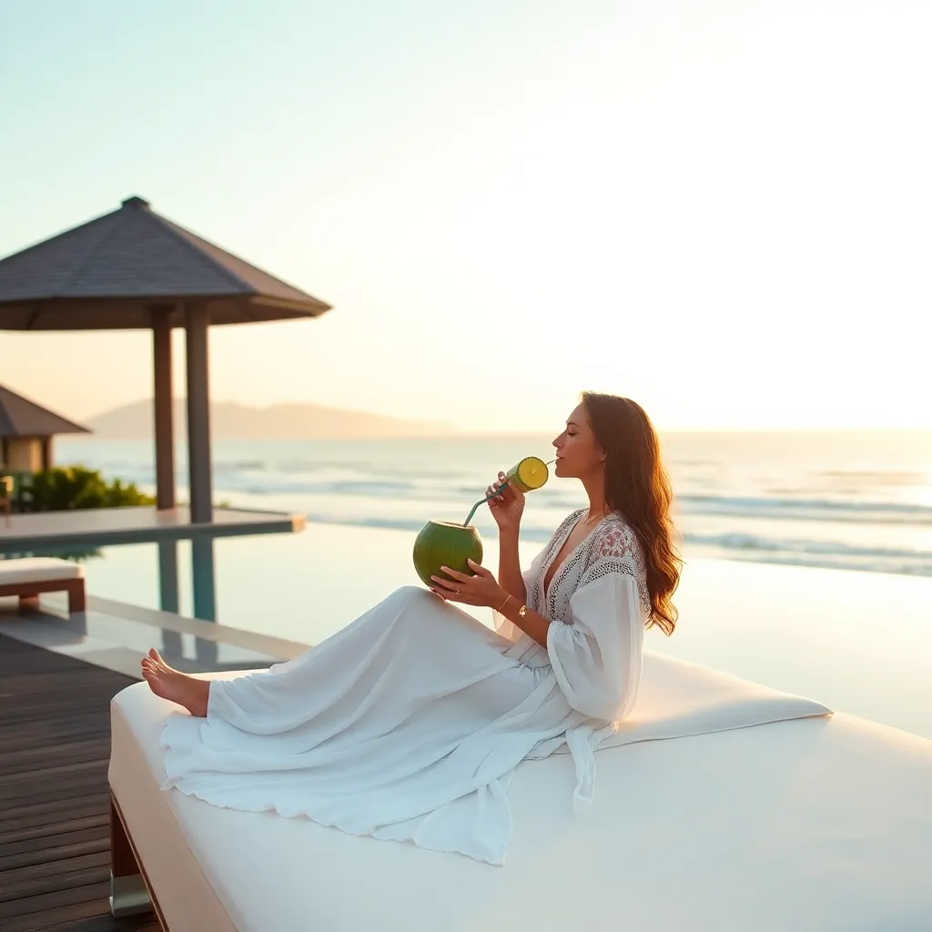 Capture the essence of Bali's tranquil beauty! Imagine a serene beachside setting at sunrise, with a stunning infinity pool overlooking the Indian Ocean. A stylish influencer, dressed in a flowing white kaftan, sits on a plush daybed, sipping a refreshing coconut drink. Soft morning light casts a warm glow.
