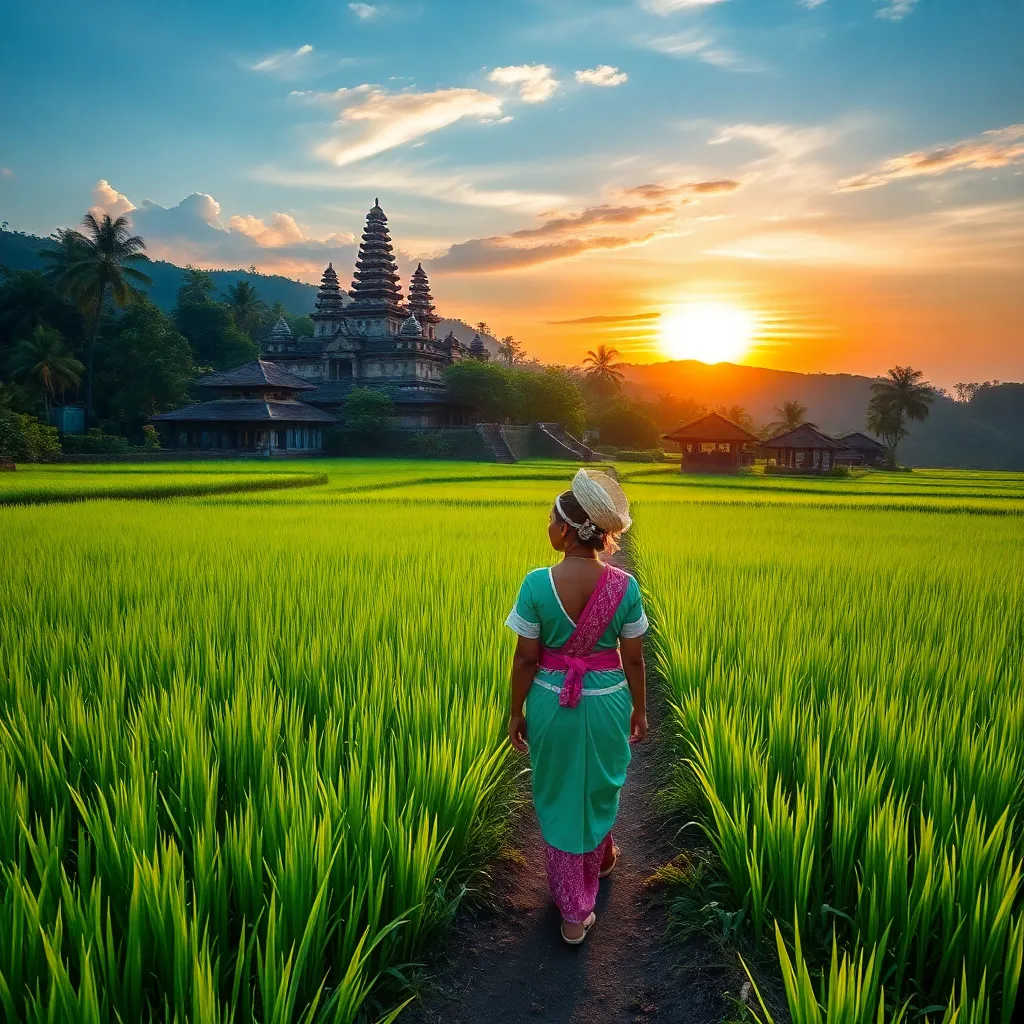 Capture the essence of Bali's vibrant culture and stunning landscapes. Imagine a serene rice field at sunrise, with a Balinese woman in traditional clothing walking towards the camera, surrounded by lush greenery and a majestic temple in the distance. Create a breathtaking image that embodies the island's tranquility and beauty.