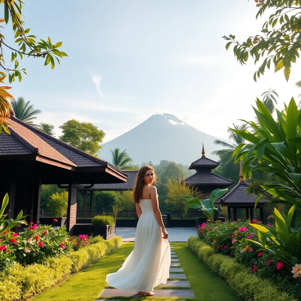 Imagine a serene morning in Ubud, Bali. Capture the tranquil atmosphere of a traditional Balinese temple, surrounded by lush greenery and vibrant flowers. Incorporate a stunning backdrop of Mount Agung, with a few wispy clouds drifting lazily across the sky. Add a beautiful influencer in a flowing white dress, surrounded by the peaceful ambiance.