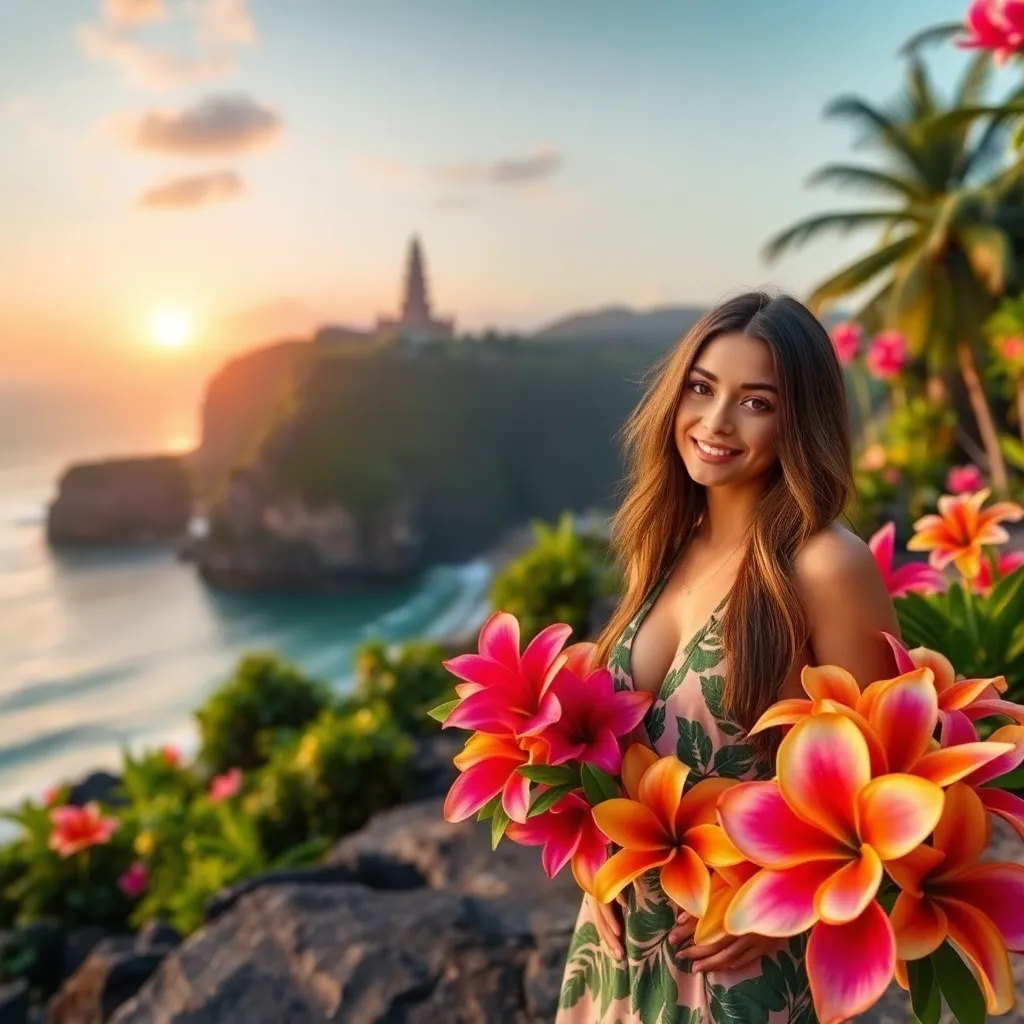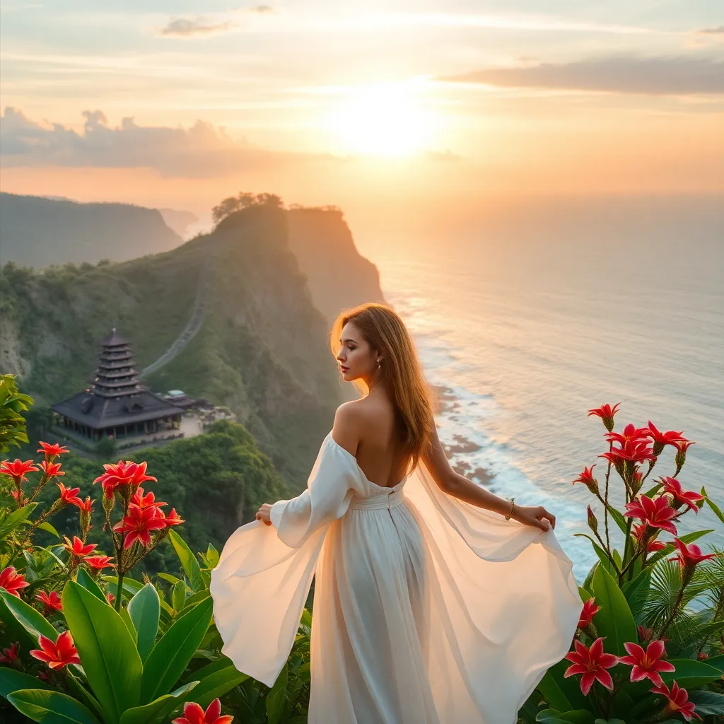 Capture the essence of Bali's tropical paradise in a stunning image. Imagine a serene morning scene at Uluwatu Temple, with a warm sun rising over the Indian Ocean, casting a golden glow on the rugged coastline and lush greenery. Incorporate a serene model in a flowing white outfit, surrounded by vibrant flowers and tropical foliage.