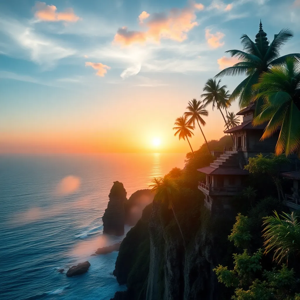 Capture the essence of Bali's serene beauty in a stunning AI-generated image. Depict a peaceful morning scene at Uluwatu Temple, with the sun rising over the Indian Ocean, palm trees swaying gently, and a wispy fog rolling in. Incorporate vibrant colors and textures to evoke a sense of tropical paradise.