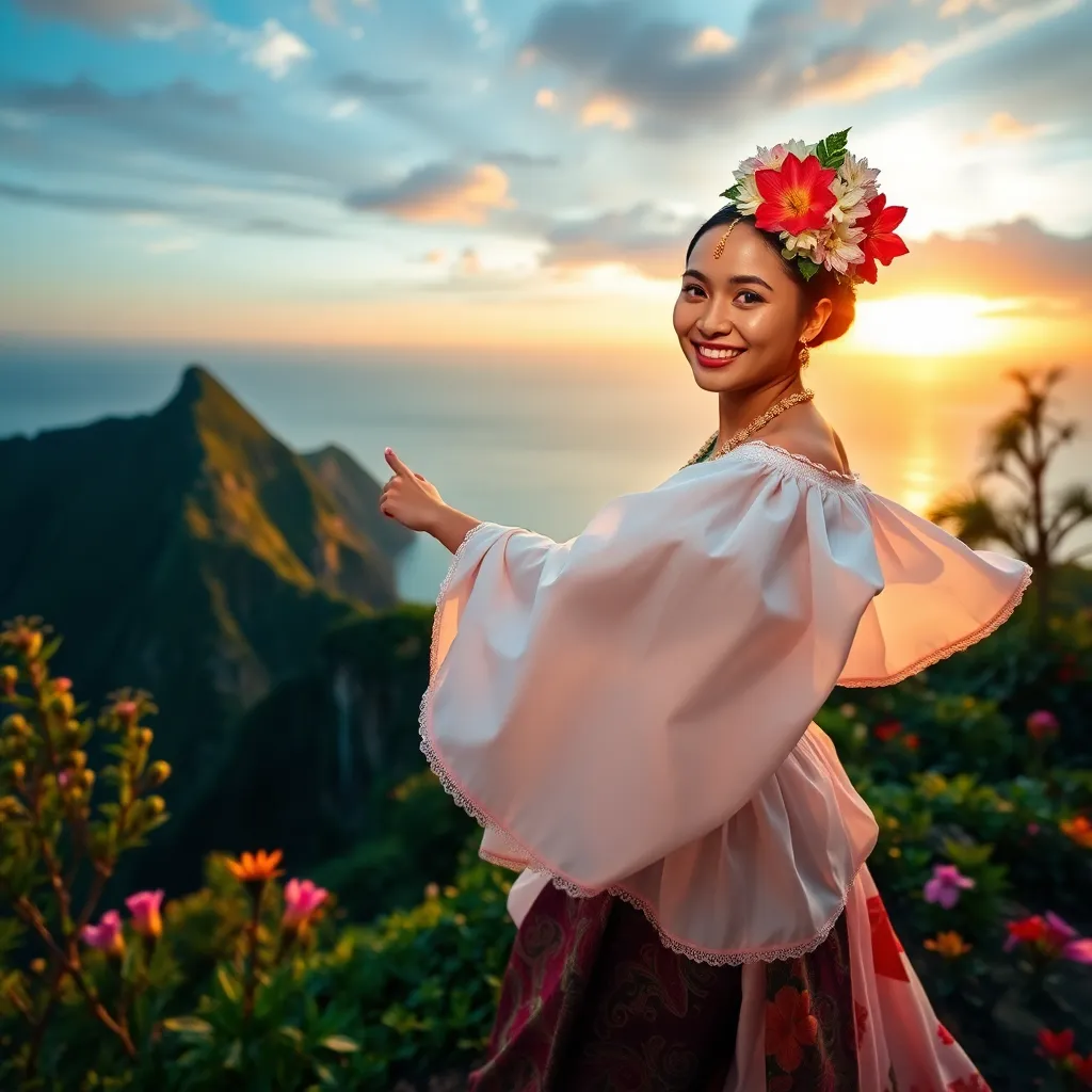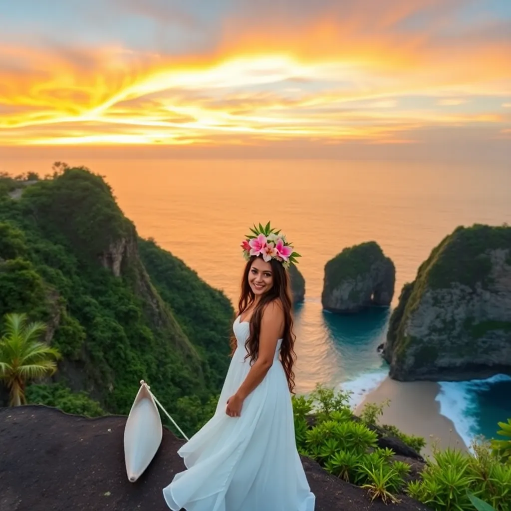 Capture the essence of Bali's sun-kissed beaches and lush green landscapes. Imagine a stunning influencer posing on a picturesque cliff overlooking the ocean, with a serene smile and a tropical flower crown. Surround her with vibrant Balinese textiles, lush palm trees, and a warm golden glow. Create a dreamy, Instagram-worthy scene.