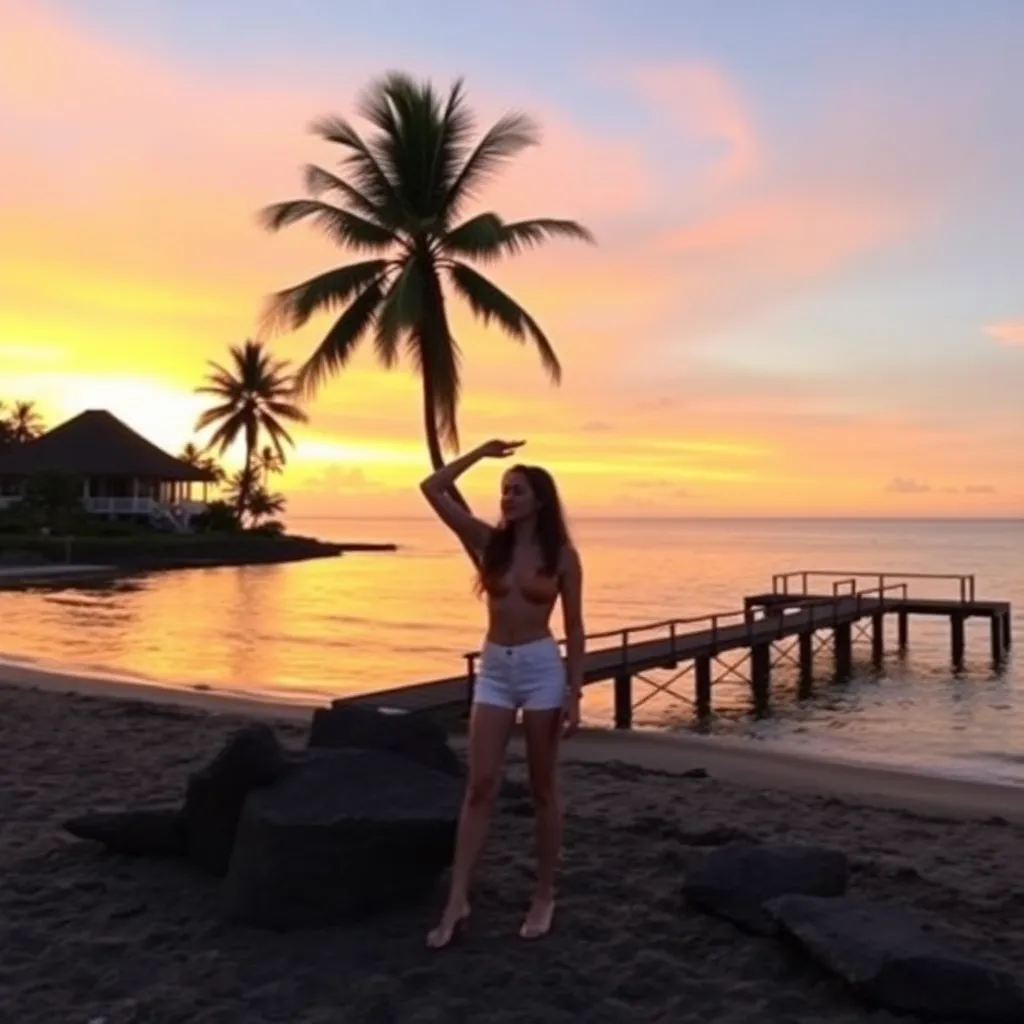 Capture the essence of Bali's tropical paradise! Imagine a serene beach scene at sunset, with a stunning villa in the background, palm trees swaying gently, and a picturesque pier stretching into the calm ocean. The sky is painted with hues of orange, pink, and purple. What's your influencer's pose?