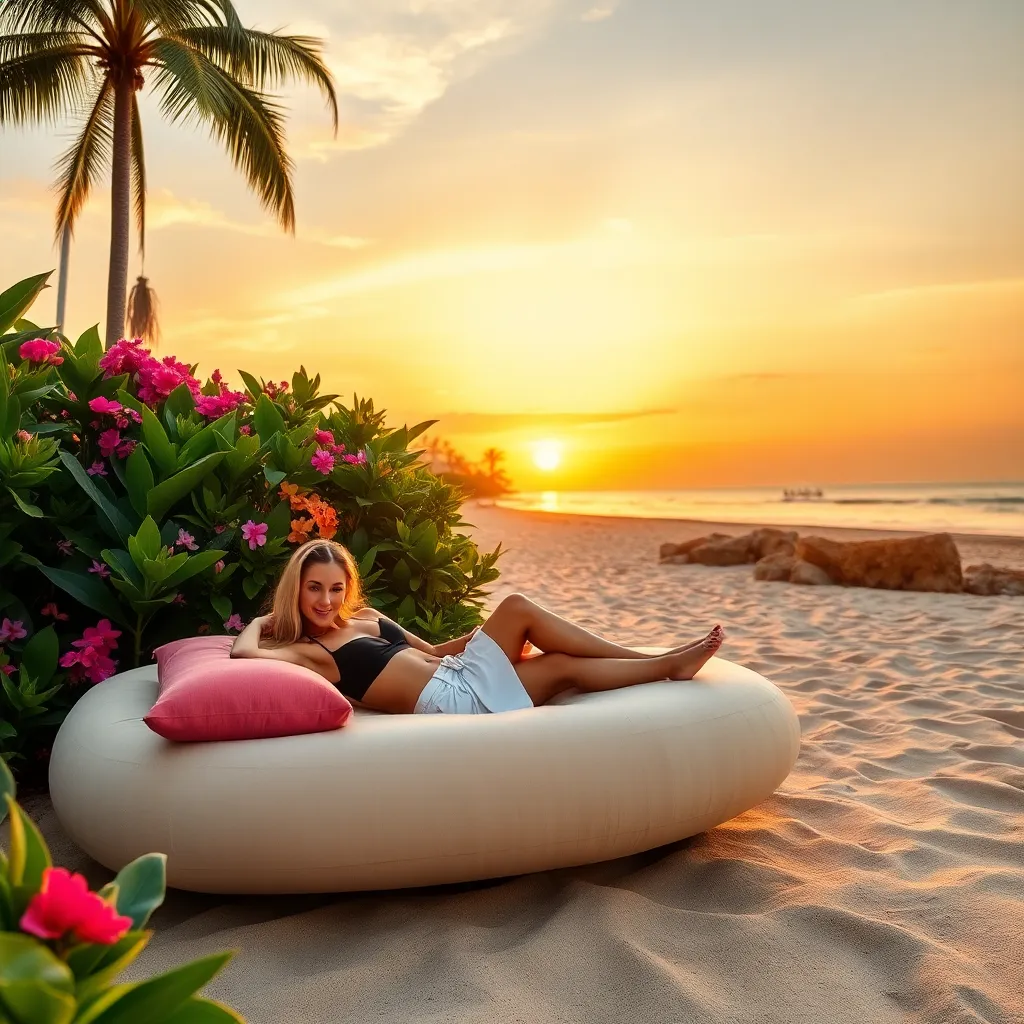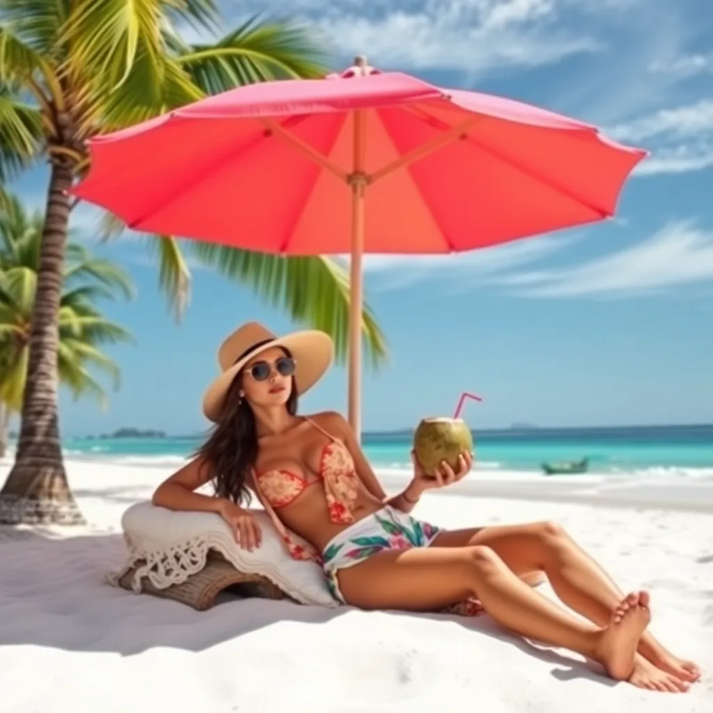 Capture the essence of tropical bliss! Imagine a stunning Bali influencer lounging on a picturesque beach, surrounded by lush greenery and crystal-clear waters. She's dressed in a flowy white maxi dress, with a statement hat and oversized sunglasses. The sun is setting, casting a warm golden glow on the scene.