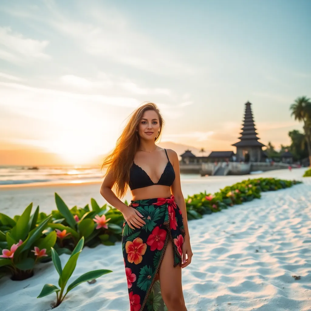 Capture the essence of Bali's serene beaches and lush green landscapes. Imagine a stunning influencer posing on a powdery white sand beach, with a majestic temple in the background and a warm sunset glow. Incorporate tropical flowers, a vibrant sarong, and a relaxed, effortless vibe to evoke a sense of tropical paradise.