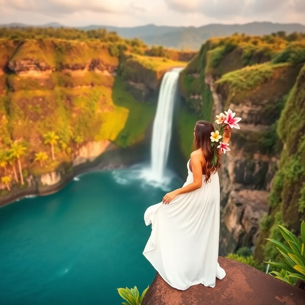Capture the essence of Bali's serene beaches and lush green landscapes. Create an AI image of a stylish influencer posing on a picturesque cliff overlooking the Indian Ocean, with a stunning waterfall in the background, wearing a flowing white dress and adorned with tropical flowers, with a warm golden glow.