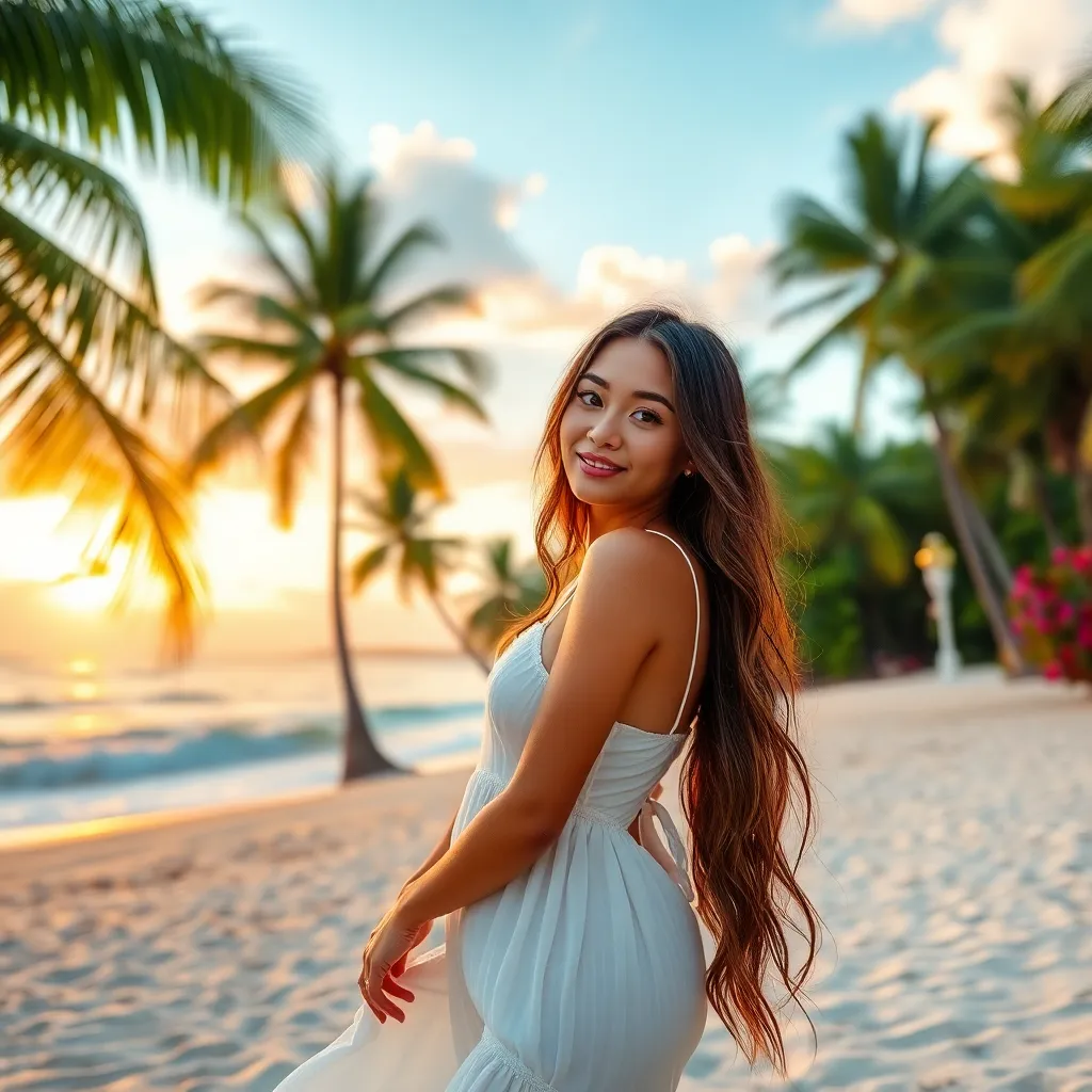 Capture the essence of Bali's tropical paradise! Imagine a stunning influencer posing on a pristine beach at sunset, surrounded by lush green palm trees and vibrant flowers. The influencer is dressed in a flowing white sundress, with a relaxed yet radiant expression. The image should exude serenity and beauty.