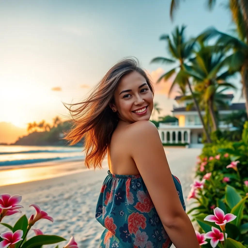Capture the essence of tropical bliss! Create an AI-generated image of a stunning Bali influencer posing on a picturesque beach at sunset, surrounded by lush green palm trees and vibrant flowers. Her hair flows in the gentle breeze, and her warm smile radiates serenity. Incorporate a luxurious villa in the background.