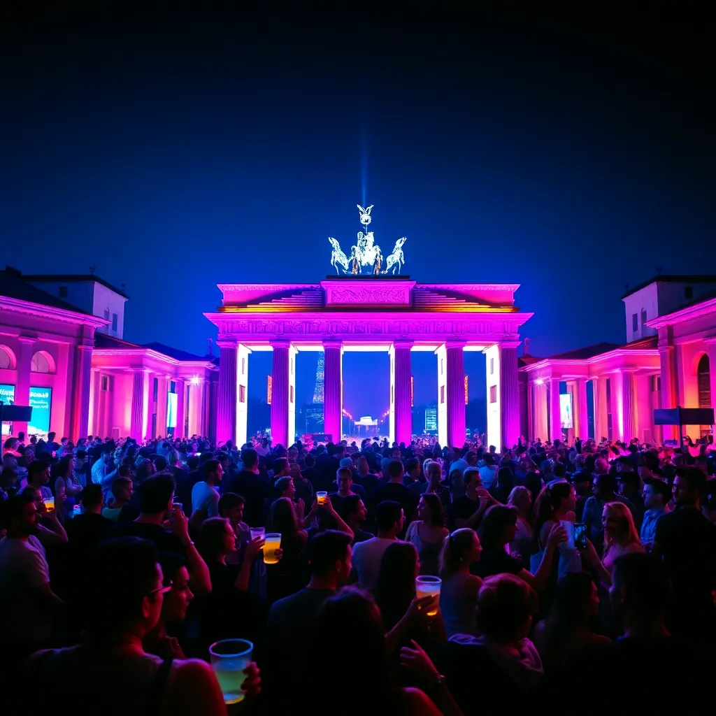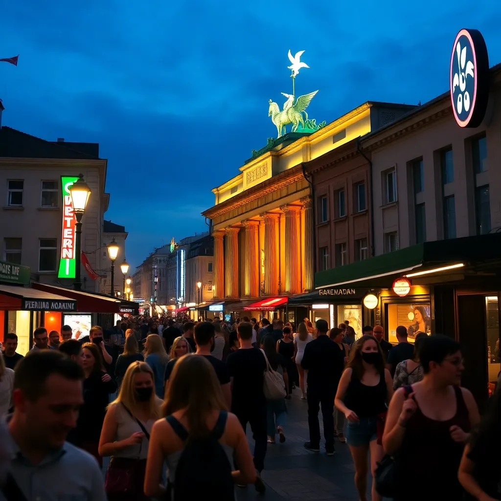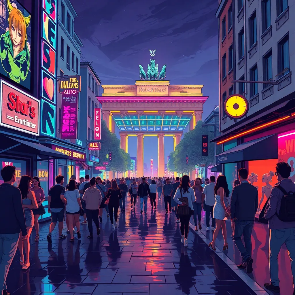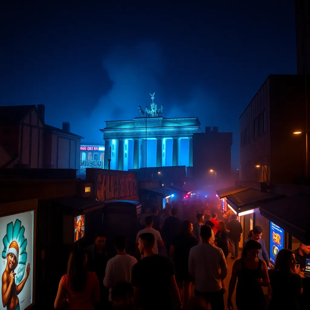 Capture the vibrant essence of Berlin's nightlife in a futuristic illustration. Imagine a cityscape bathed in neon lights, with clubs and bars pulsating with energy. Incorporate iconic landmarks like the Berlin Wall or the Brandenburg Gate, surrounded by ravers, DJs, and street performers, all united in the city's infectious rhythm.