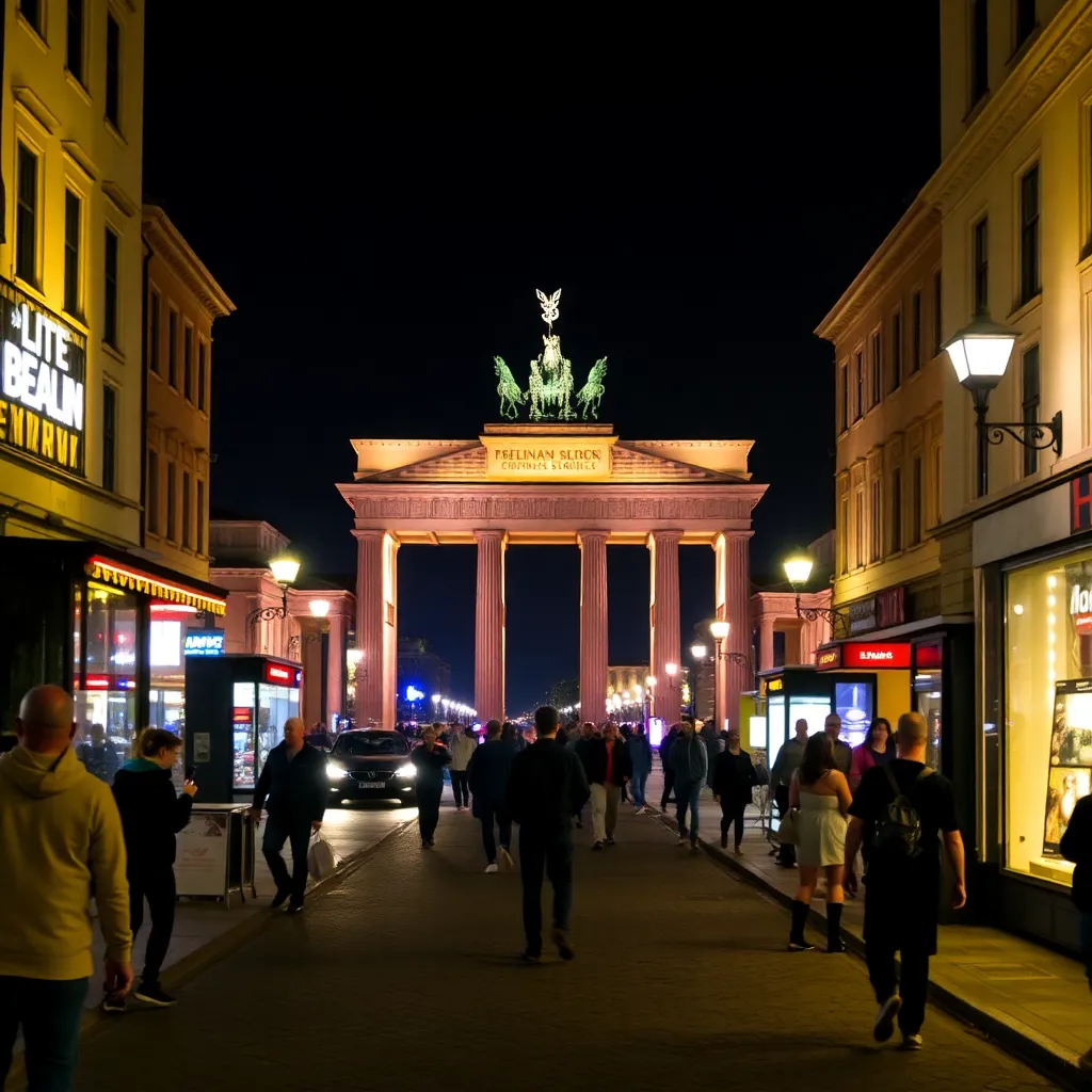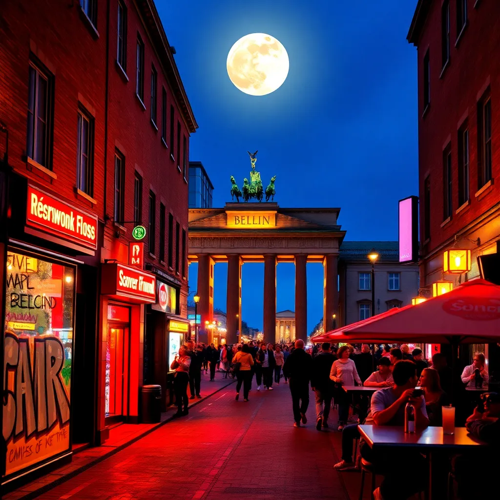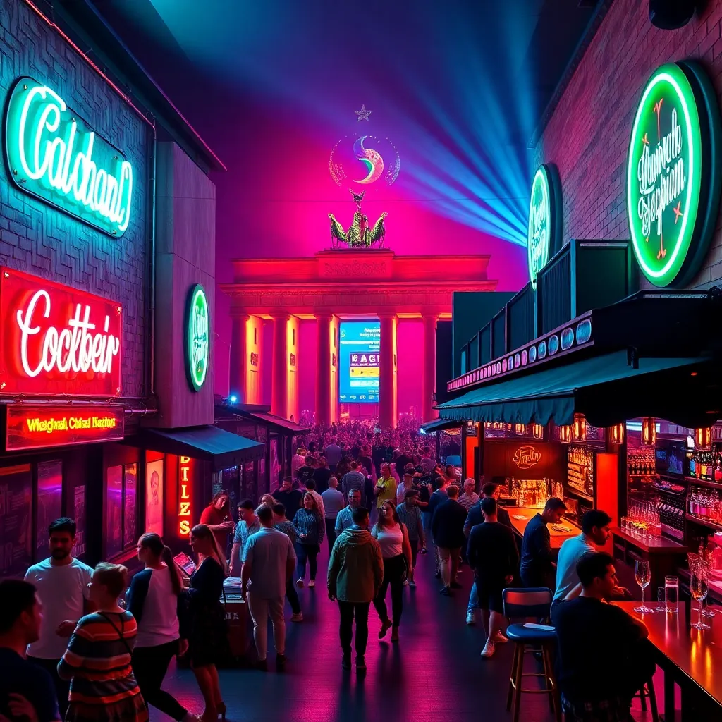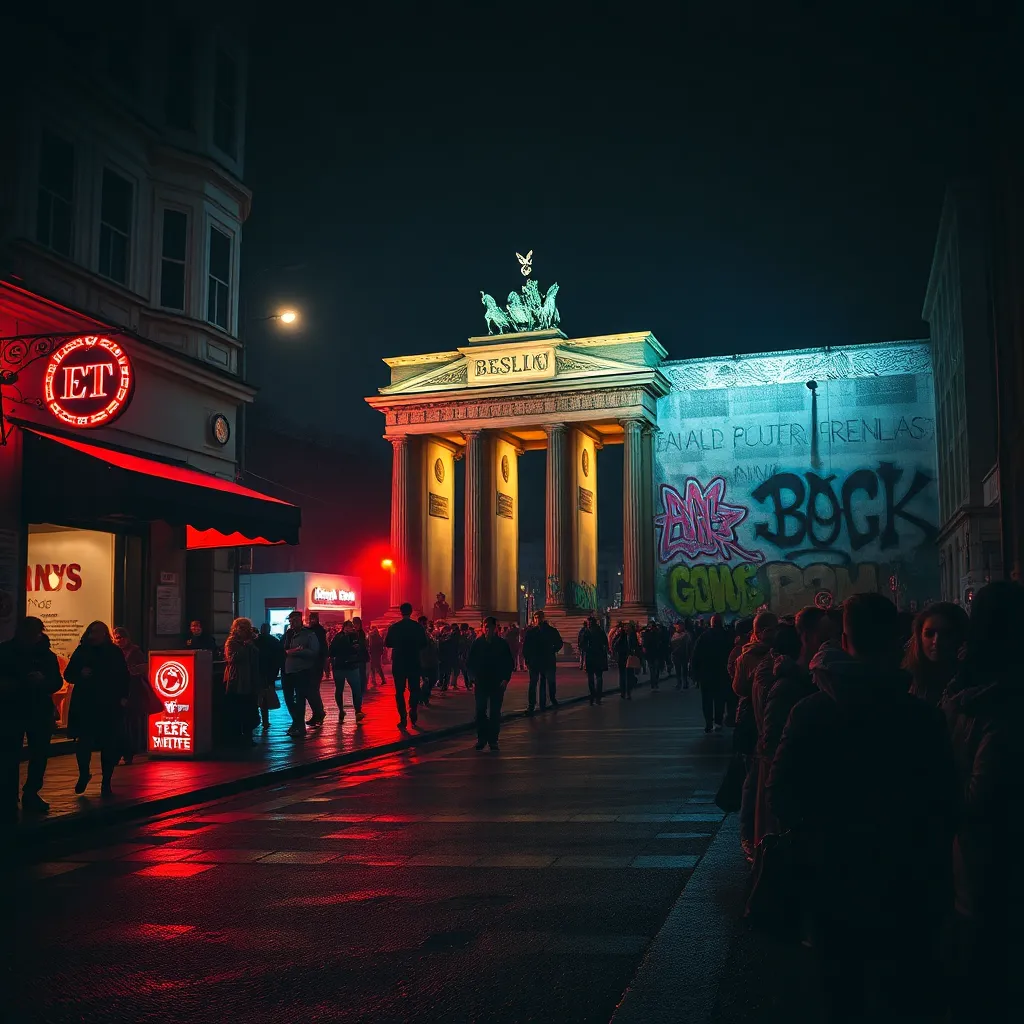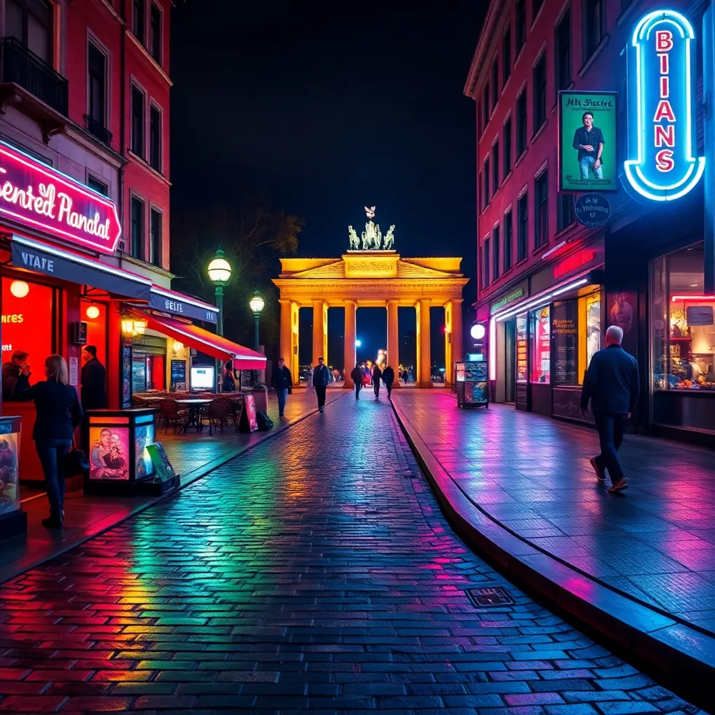 Capture the vibrant energy of Berlin's nightlife in a stunning image. Imagine the neon lights of Kreuzberg's bars and clubs reflecting off the wet cobblestones, while the sounds of techno music and laughter fill the air. Incorporate iconic landmarks like the Berlin Wall or Brandenburg Gate in the background.