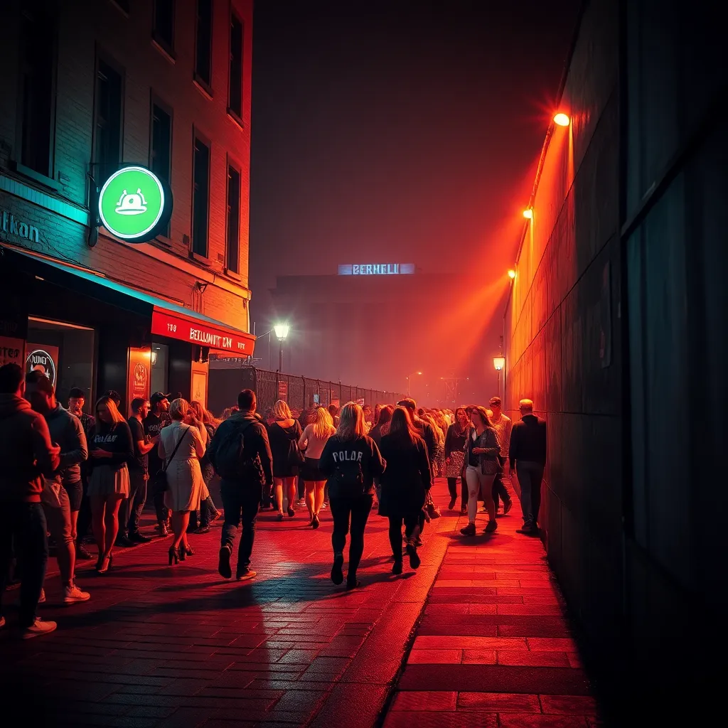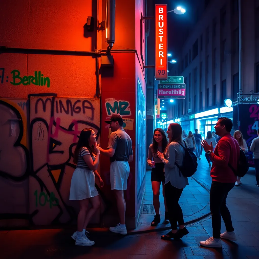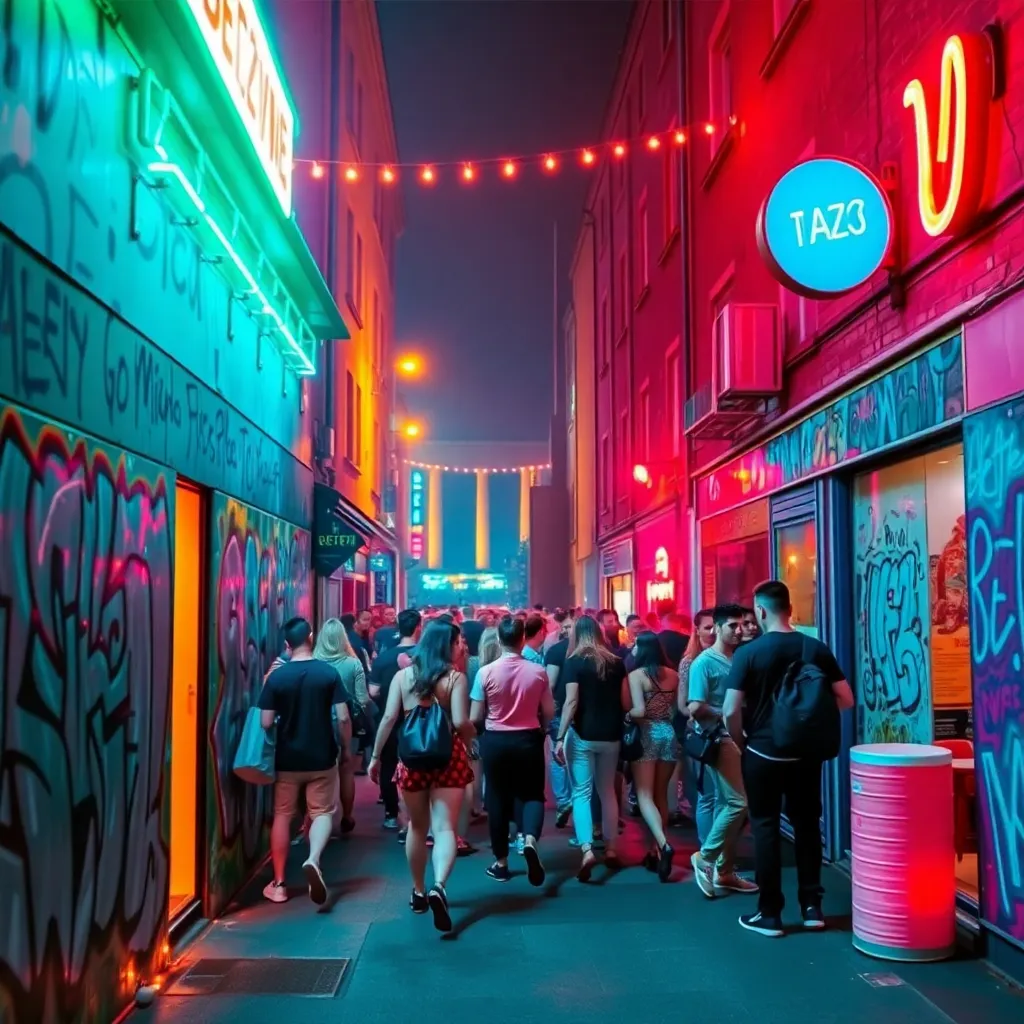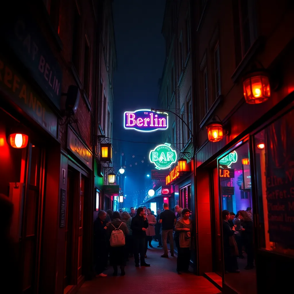 Capture the vibrant energy of Berlin's nightlife in a captivating image. Imagine a darkened alleyway in the Kreuzberg district, illuminated only by the neon lights of a bustling bar. The air is alive with the hum of conversation and the thumping beat of electronic music. What does the scene look like?