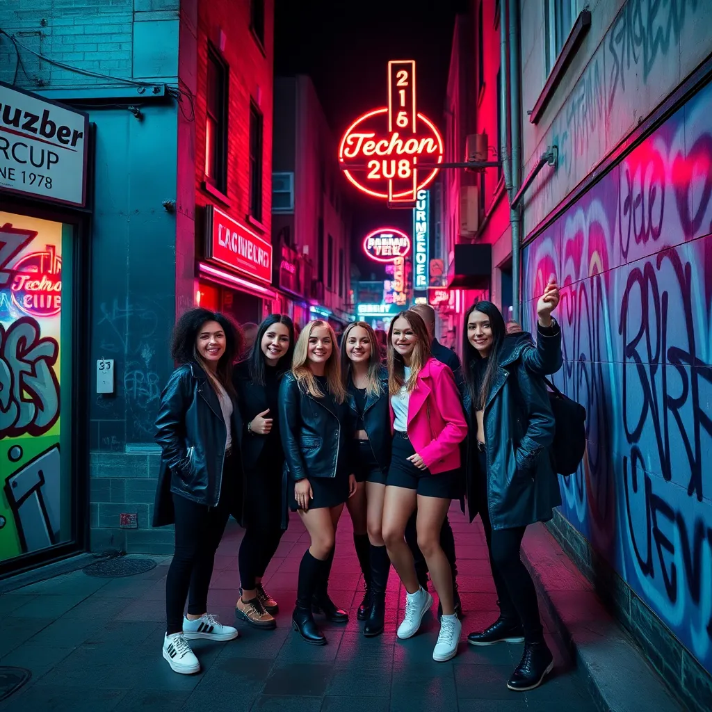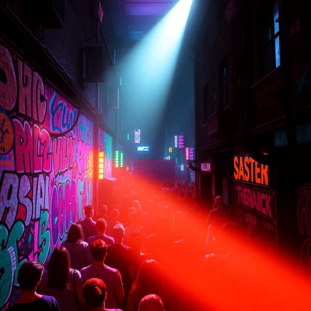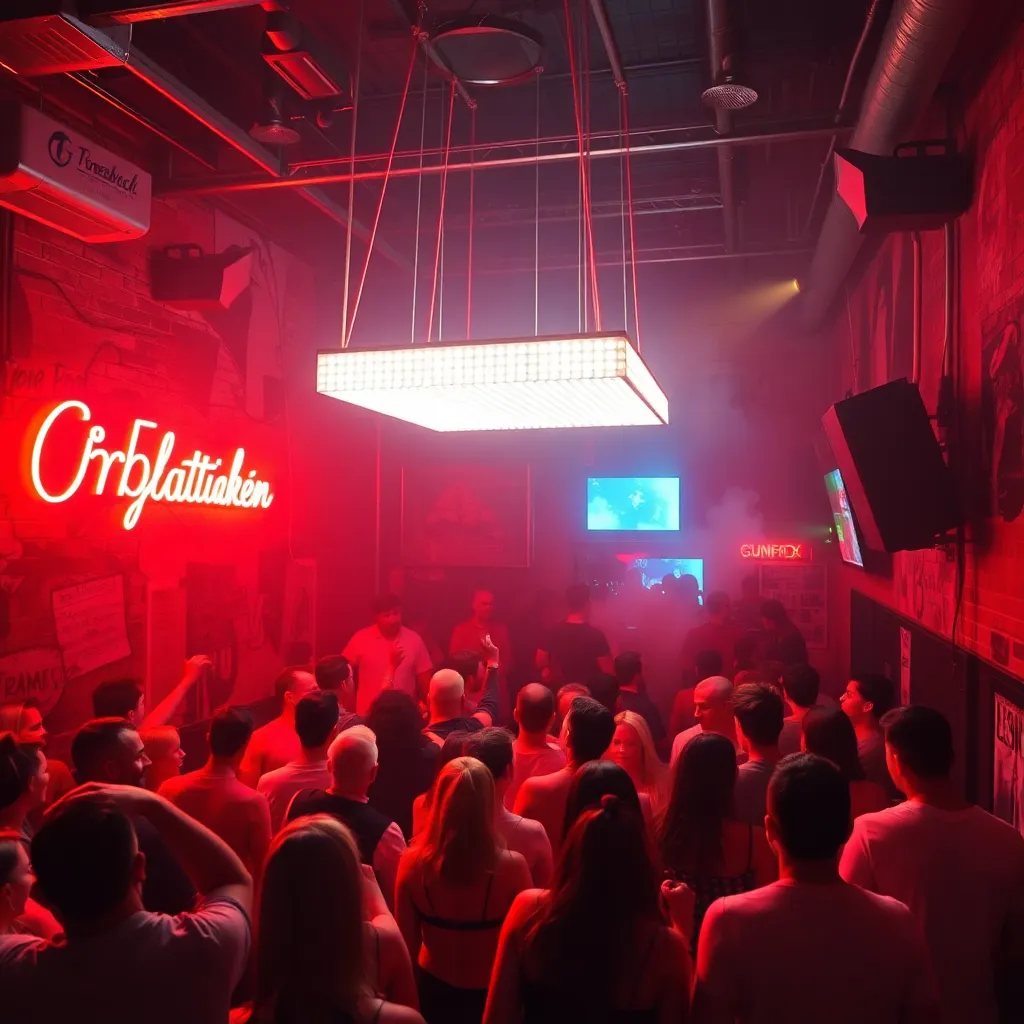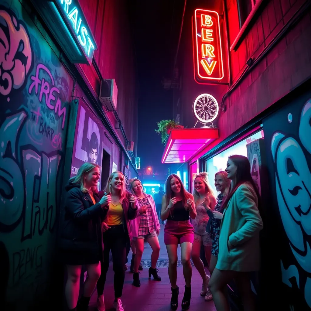 Capture the vibrant energy of Berlin's nightlife in a captivating image. Imagine a darkened alleyway in the Kreuzberg district, illuminated only by the neon lights of a bustling bar. The air is alive with the hum of conversation and the thumping beat of electronic music. What does the scene look like?