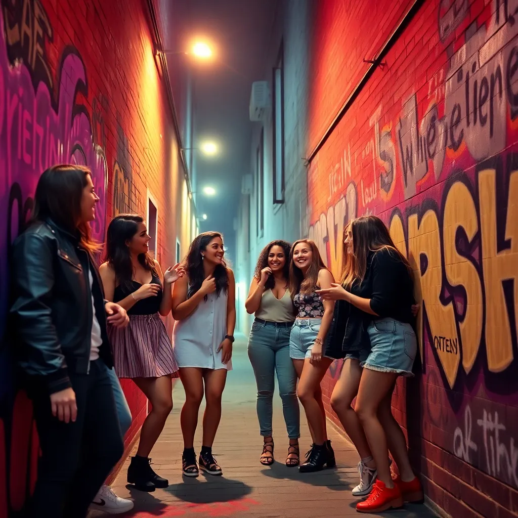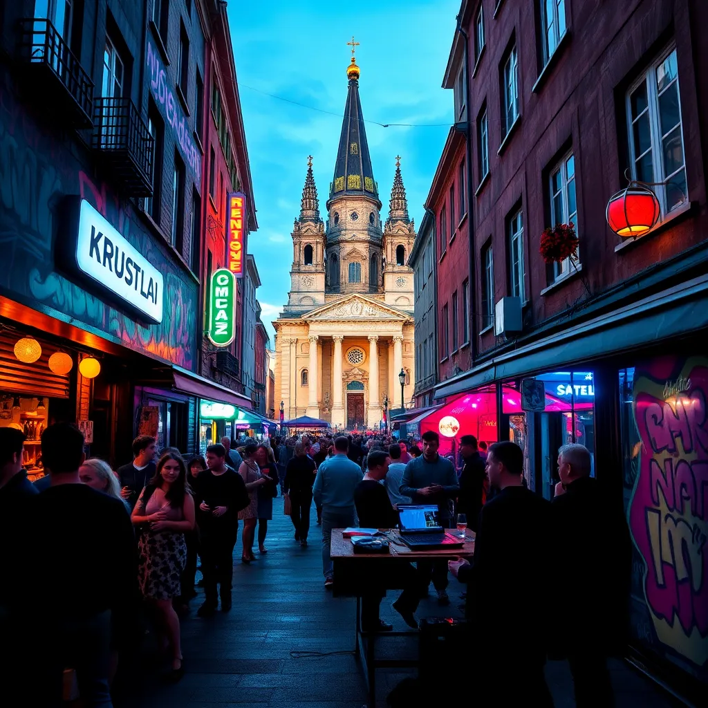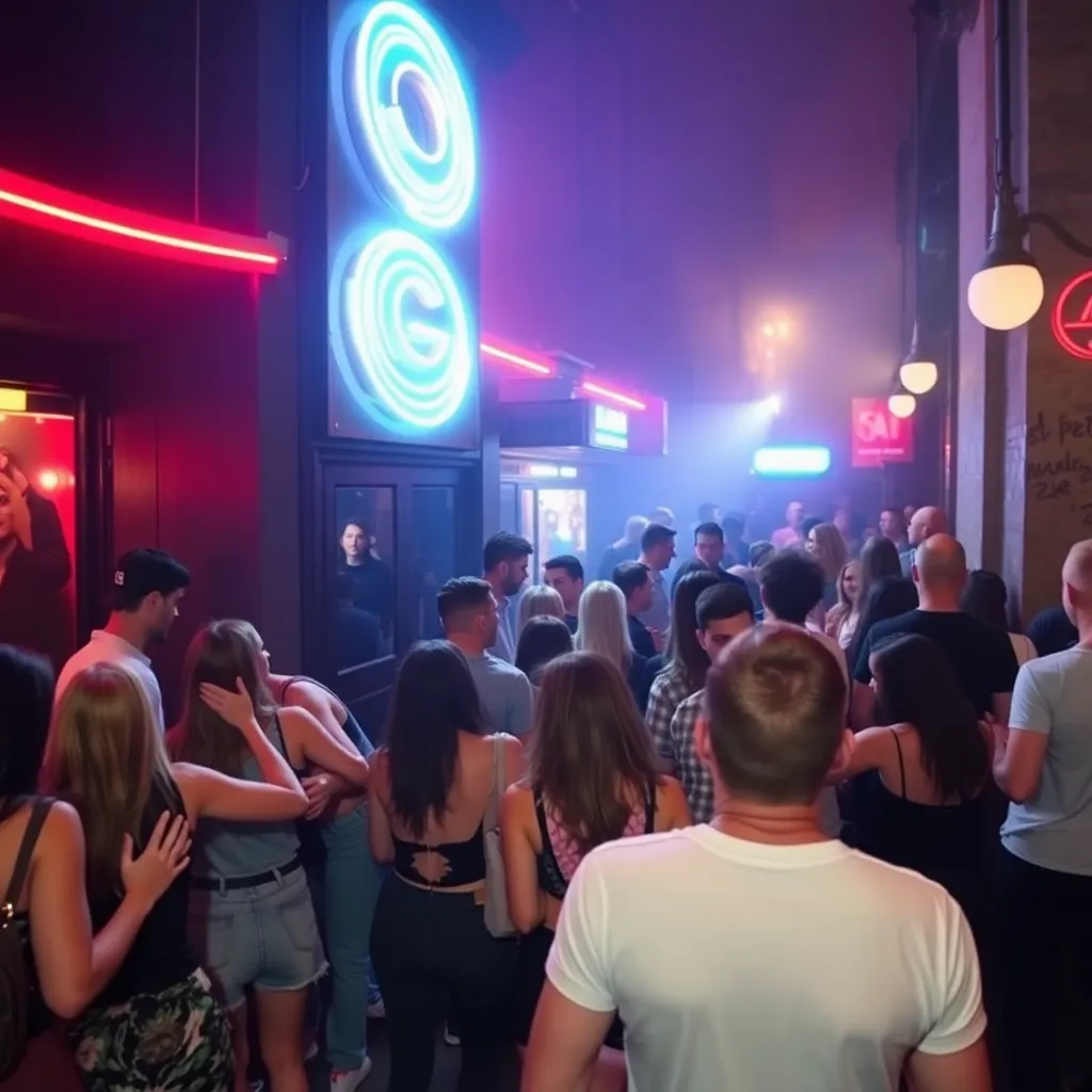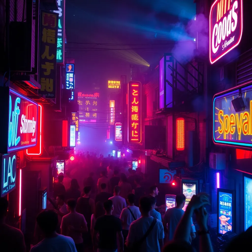 Capture the vibrant energy of Berlin's nightlife in a captivating image. Imagine a darkened alleyway in the Kreuzberg district, illuminated only by the neon lights of a bustling bar. The air is alive with the hum of conversation and the thumping beat of electronic music. What does the scene look like?