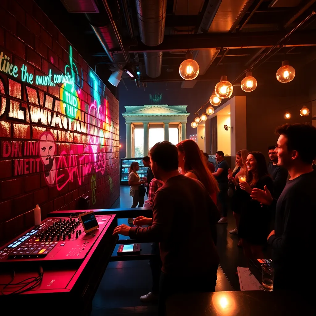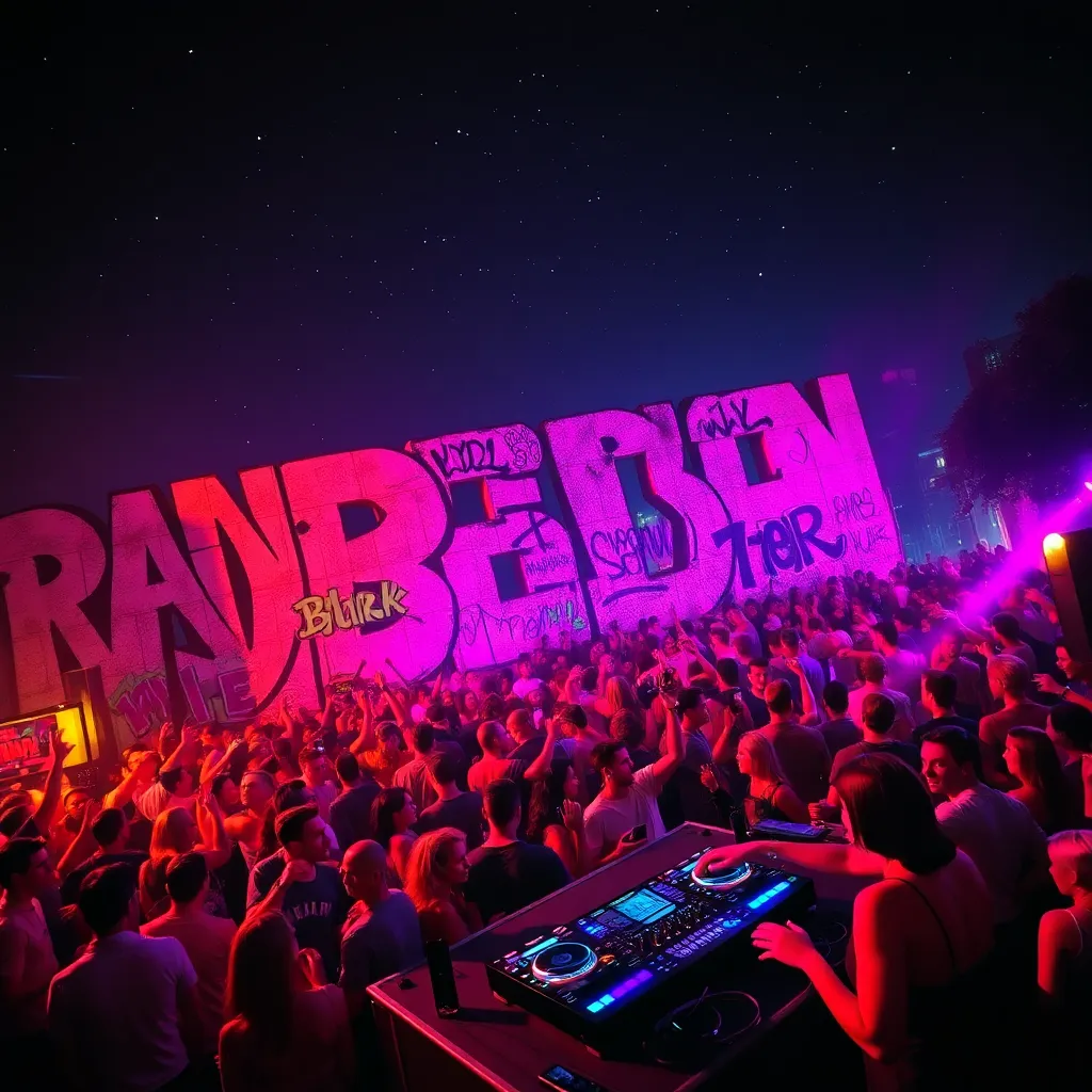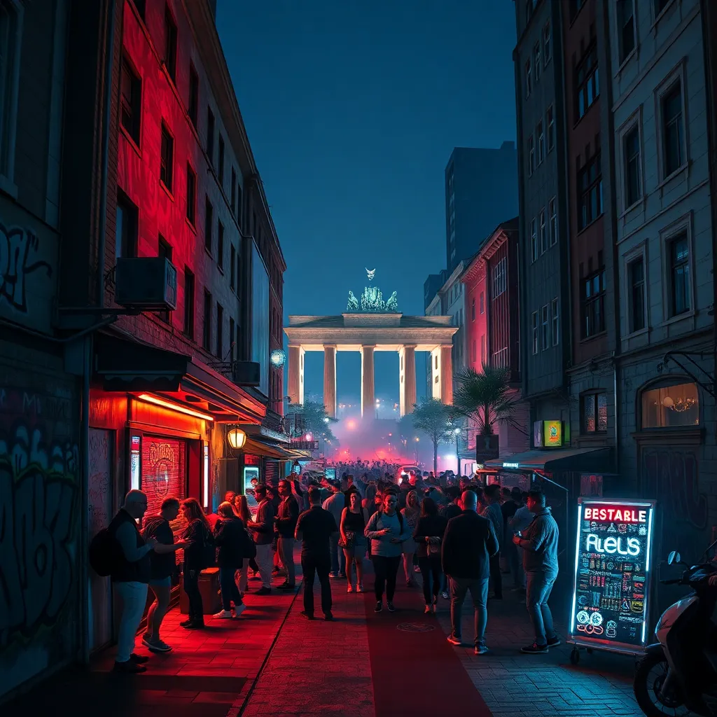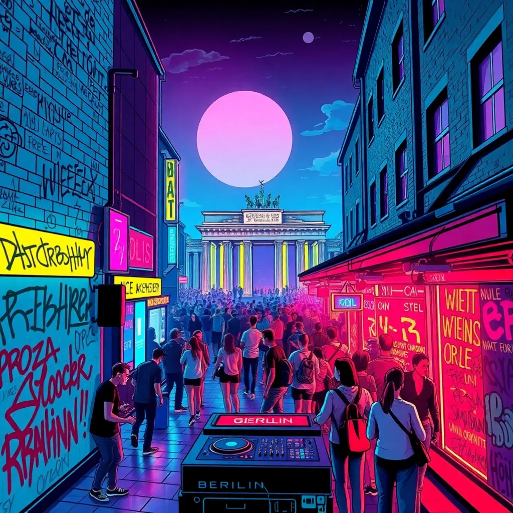 Capture the vibrant energy of Berlin's nightlife in a futuristic illustration. Imagine a neon-lit street in Kreuzberg, with a crowded bar scene, graffiti-covered walls, and a DJ spinning a hypnotic beat. Incorporate iconic landmarks like the Berlin Wall or Brandenburg Gate into the background. Add a sense of movement and excitement.