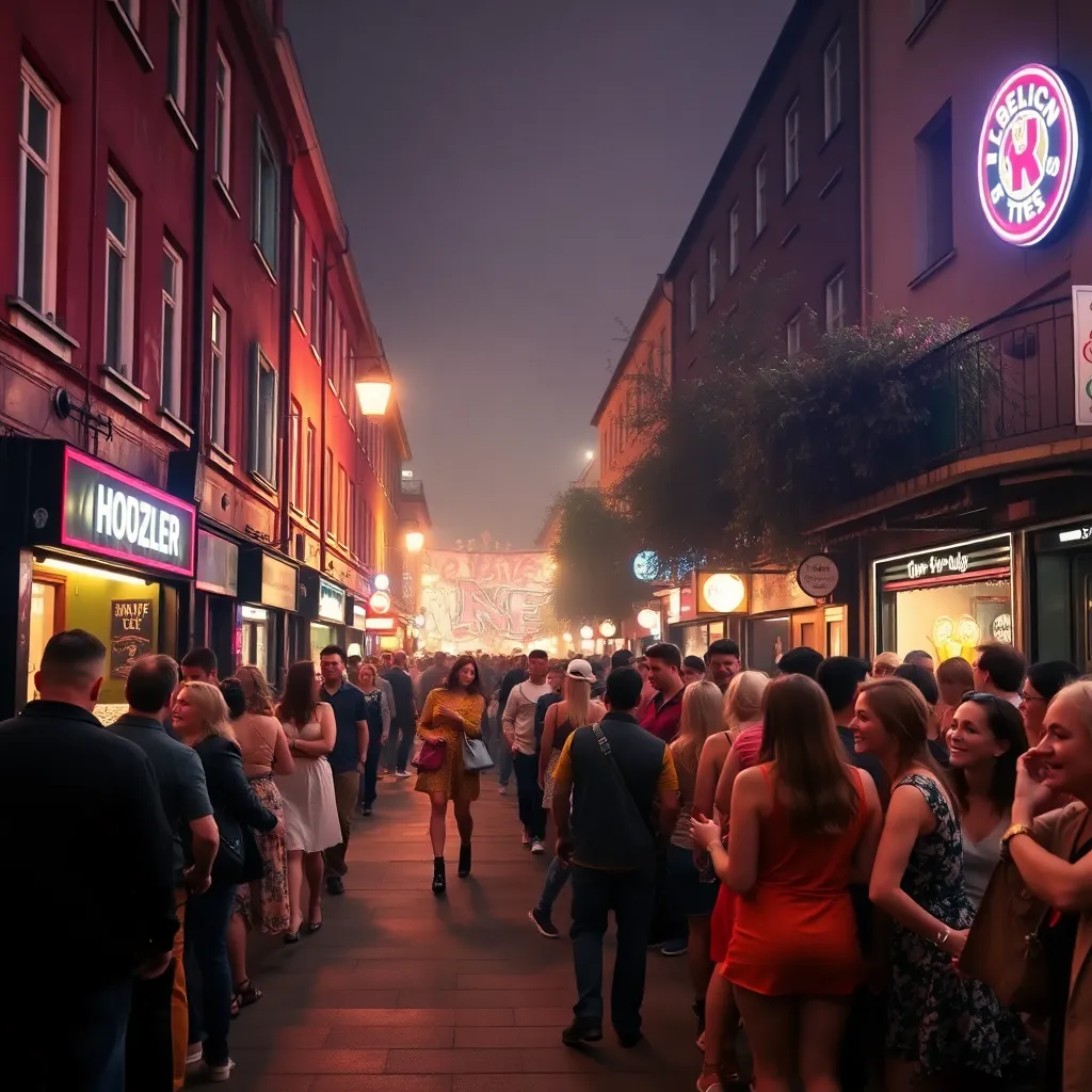 Capture the vibrant energy of Berlin's nightlife in a stunning AI-generated image. Imagine a dark, misty night in Kreuzberg, with the Berlin Wall's graffiti-covered remnants glowing neon blue in the background. The streets are filled with revelers, their laughter and music mingling with the city's industrial hum.
