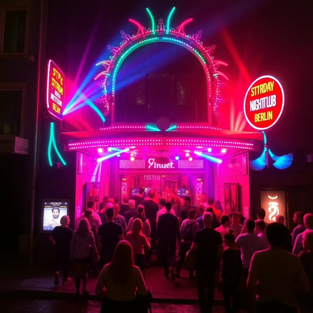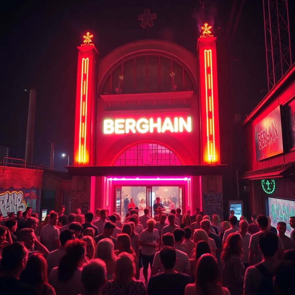 Capture the vibrant energy of Berlin's nightlife in a stunning image. Show the iconic Berghain nightclub's neon-lit façade, surrounded by a sea of revelers, neon-lit graffiti, and the city's industrial landscape. Incorporate a dash of Berlin's eclectic fashion and a sprinkle of stardust to convey the city's infectious party atmosphere.