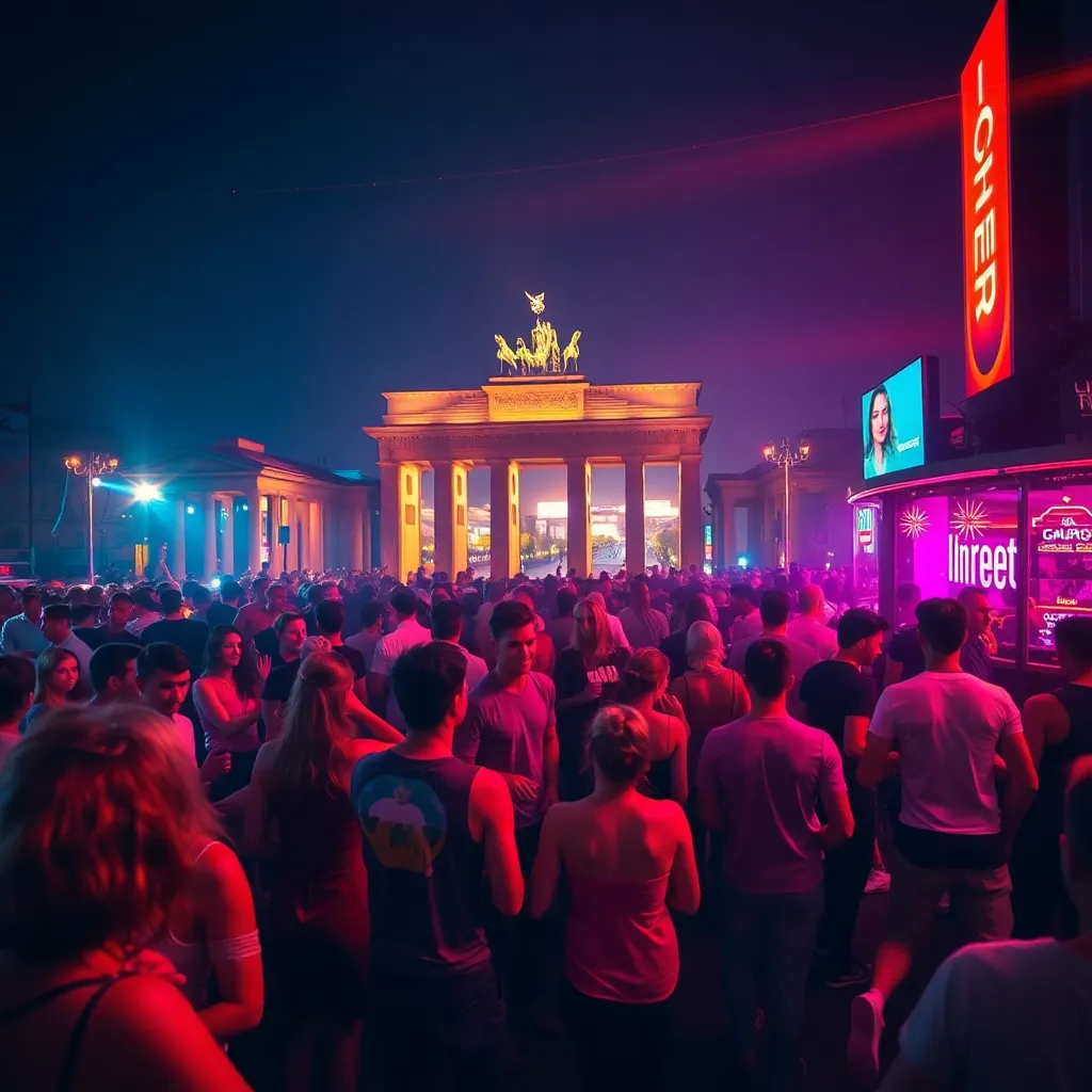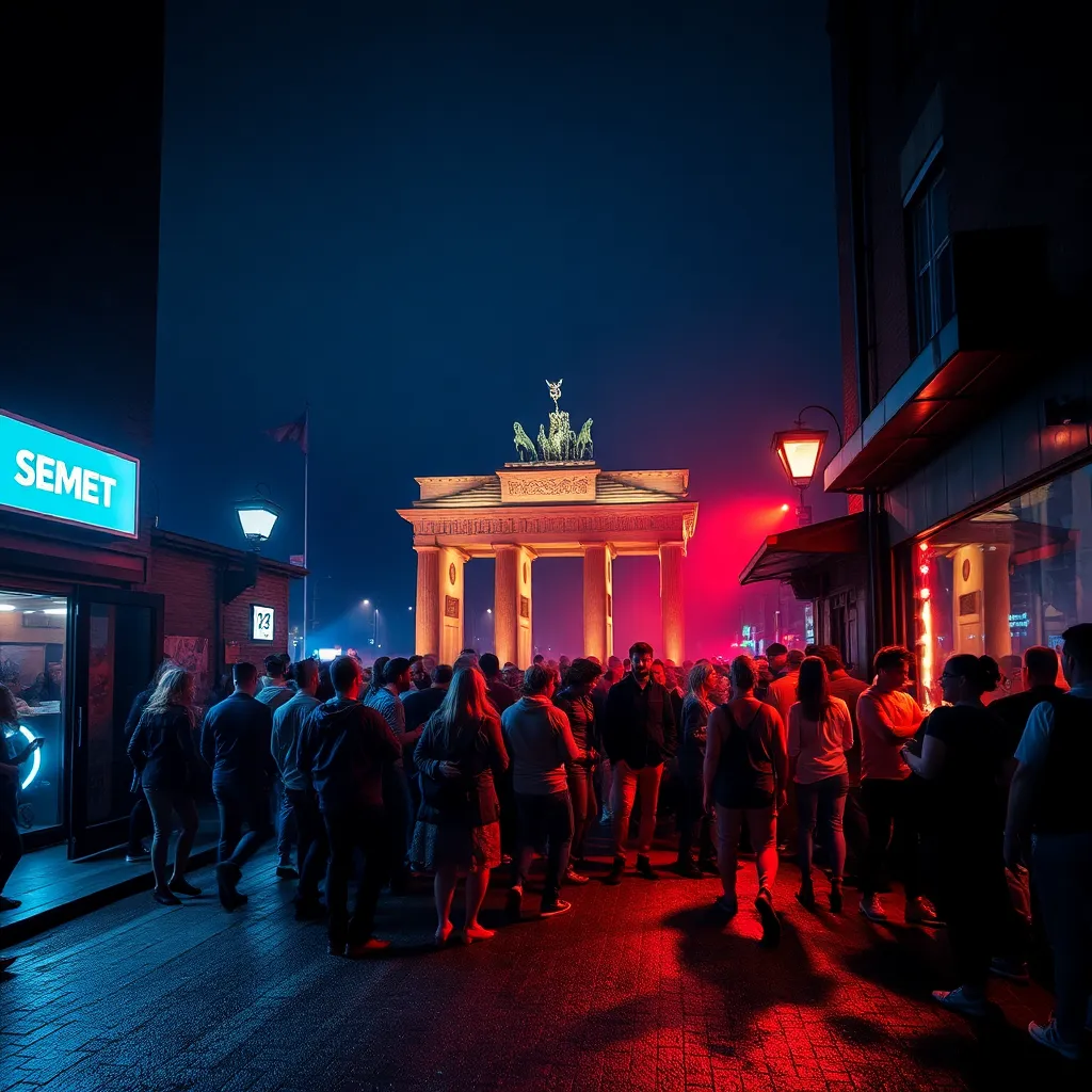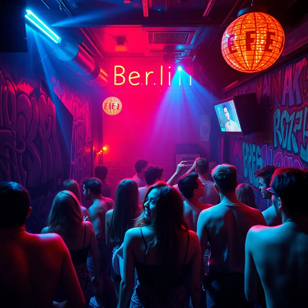 Capture the vibrant energy of Berlin's nightlife in a stunning image. Depict a bustling club or bar in the heart of the city, with neon lights reflecting off the wet pavement and a sea of people dancing and laughing together. Incorporate iconic landmarks like the Berlin Wall or Brandenburg Gate in the background.