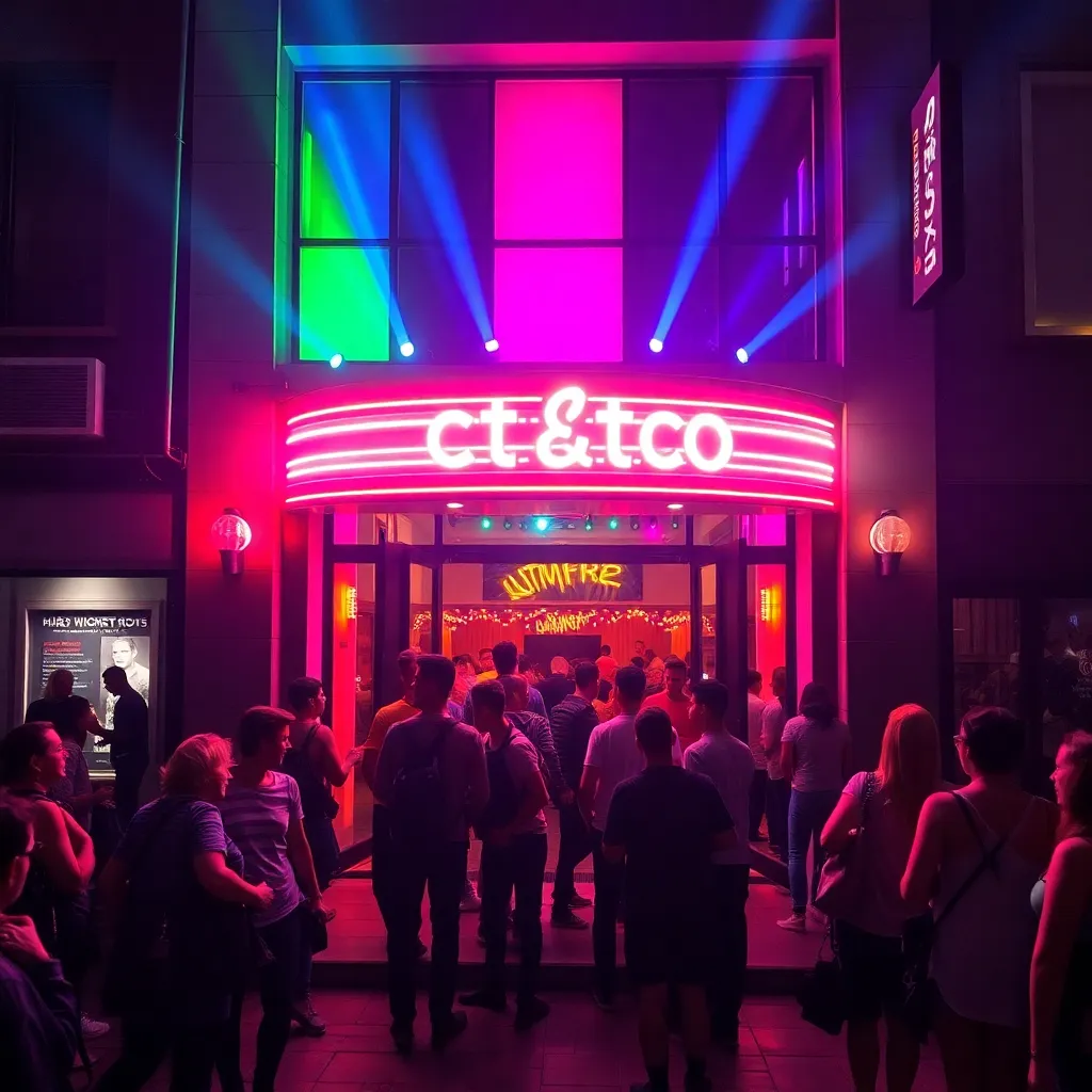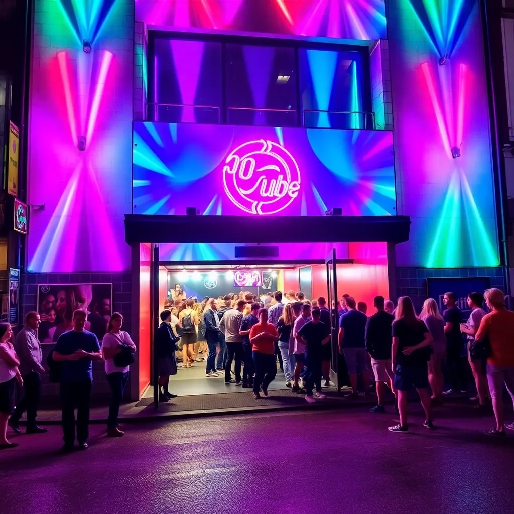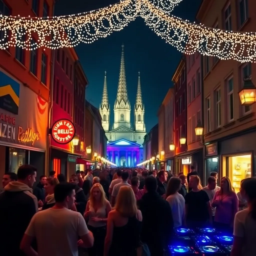 Capture the vibrant energy of Berlin's nightlife in a stunning image. Depict a bustling club or bar in the heart of the city, with neon lights reflecting off the wet pavement and a sea of people dancing and laughing together. Incorporate iconic landmarks like the Berlin Wall or Brandenburg Gate in the background.