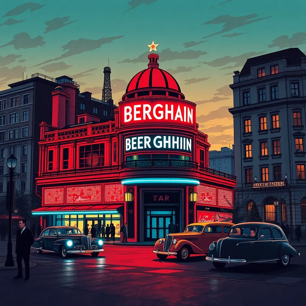 Capture the vibrant essence of Berlin's nightlife in a 1920s-inspired illustration. Depict the iconic Berghain nightclub, with its industrial façade glowing under the city's neon lights. Add a dash of retro flair with vintage-style cars and pedestrians, set against a backdrop of Berlin's historic cityscape at dusk.