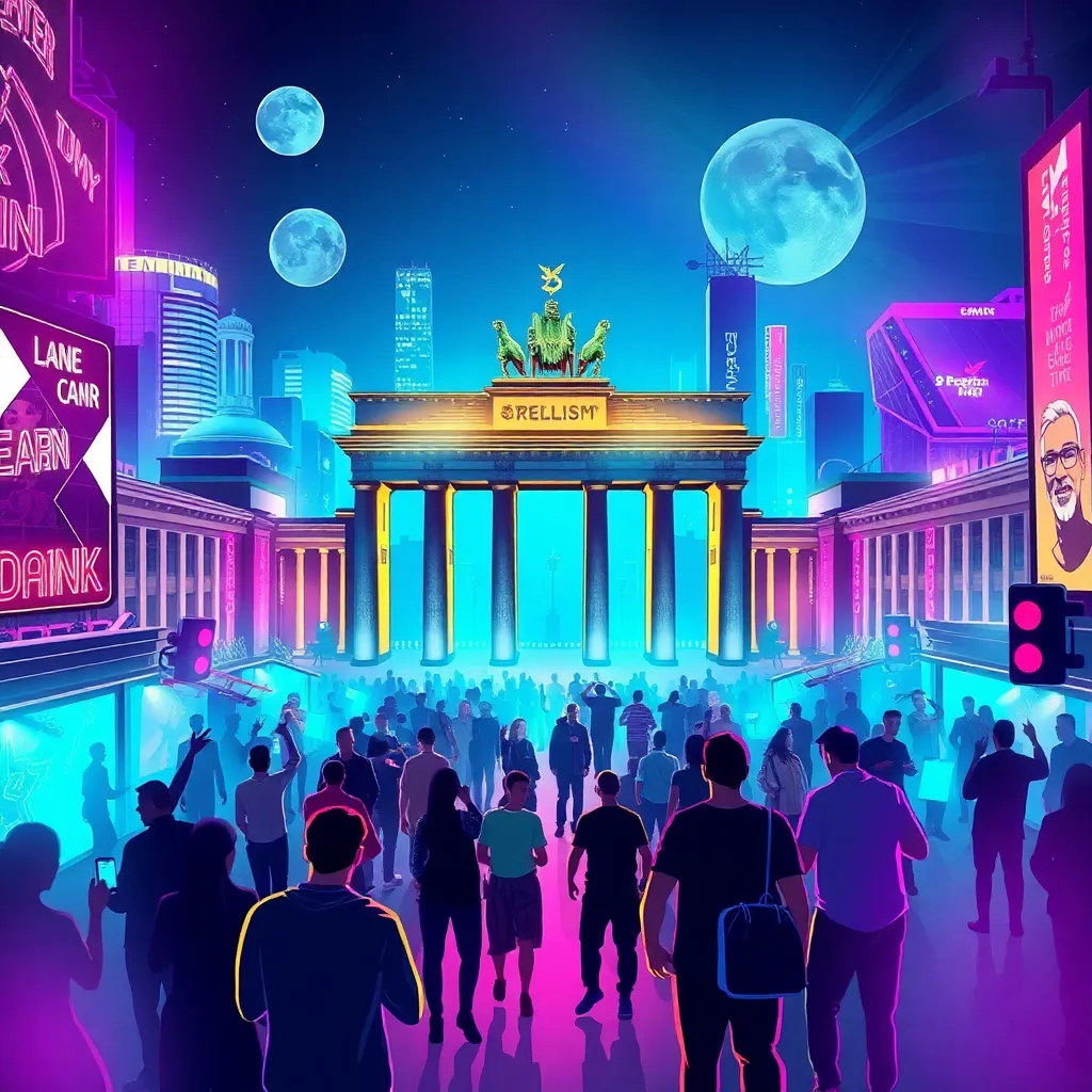 Capture the vibrant energy of Berlin's nightlife in a futuristic illustration. Depict a neon-lit street scene with a crowd of revelers gathered around a DJ spinning tracks in a converted warehouse. Incorporate iconic landmarks like the Berlin Wall and Brandenburg Gate in the background, with a hint of industrial chic.