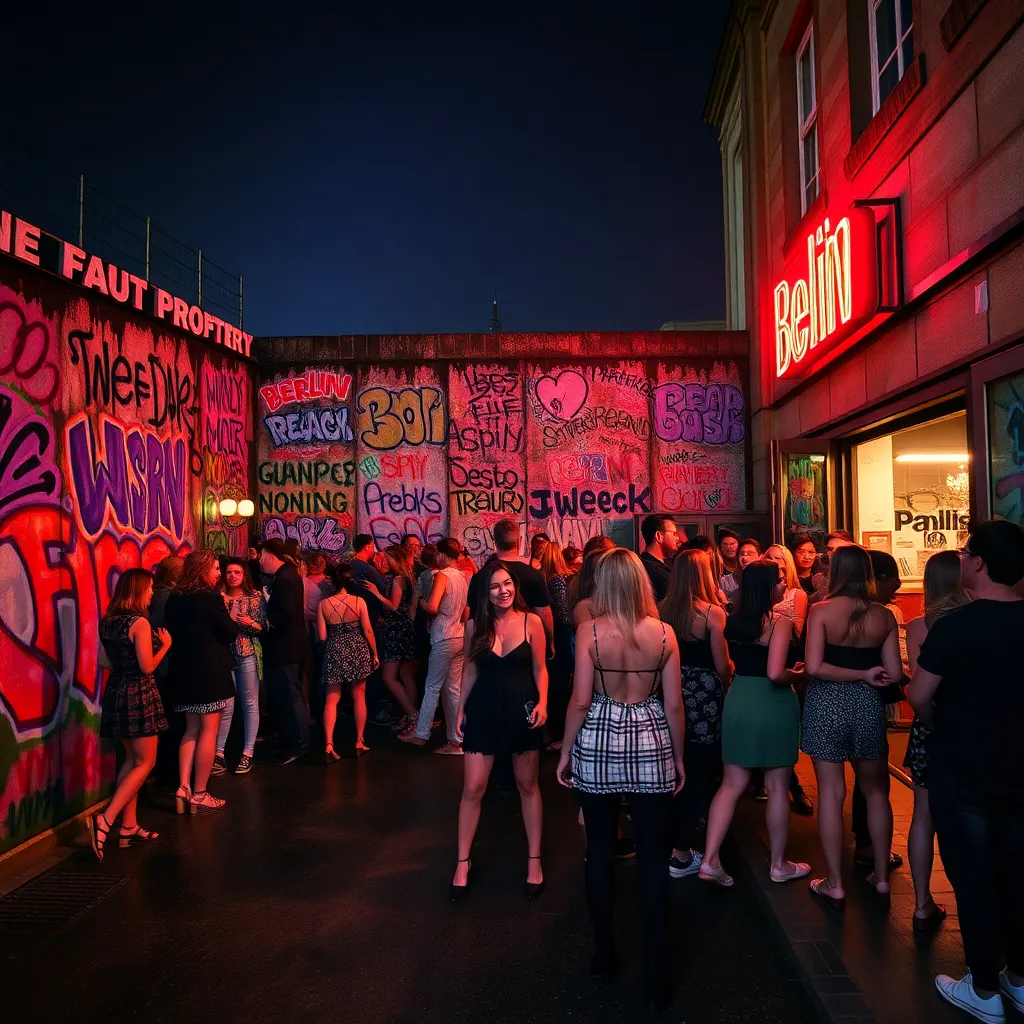 Capture the vibrant energy of Berlin's nightlife in a single image. Imagine a dark, moody street scene with neon lights reflecting off wet pavement, a crowd of revelers spilling out of a trendy club, and the iconic Berlin Wall in the background, its graffiti-covered surface glowing with an otherworldly light.