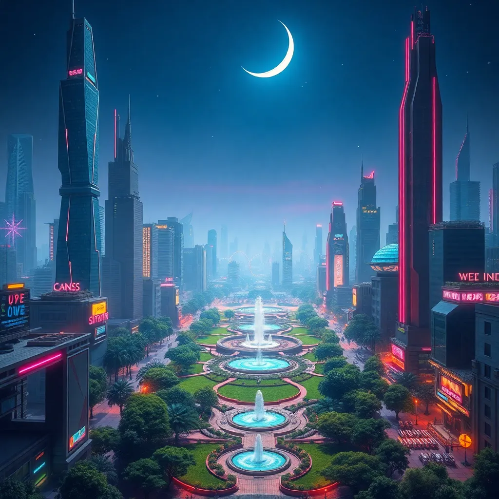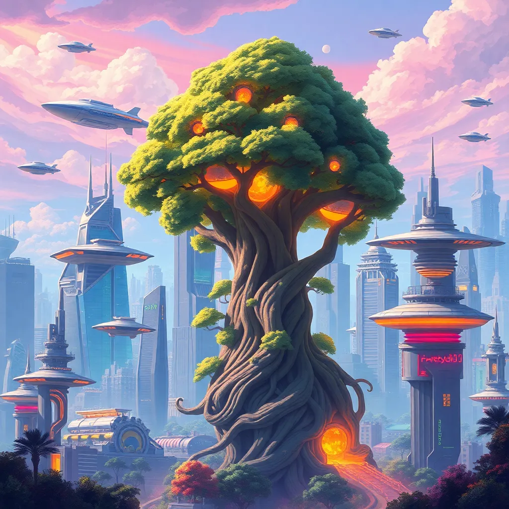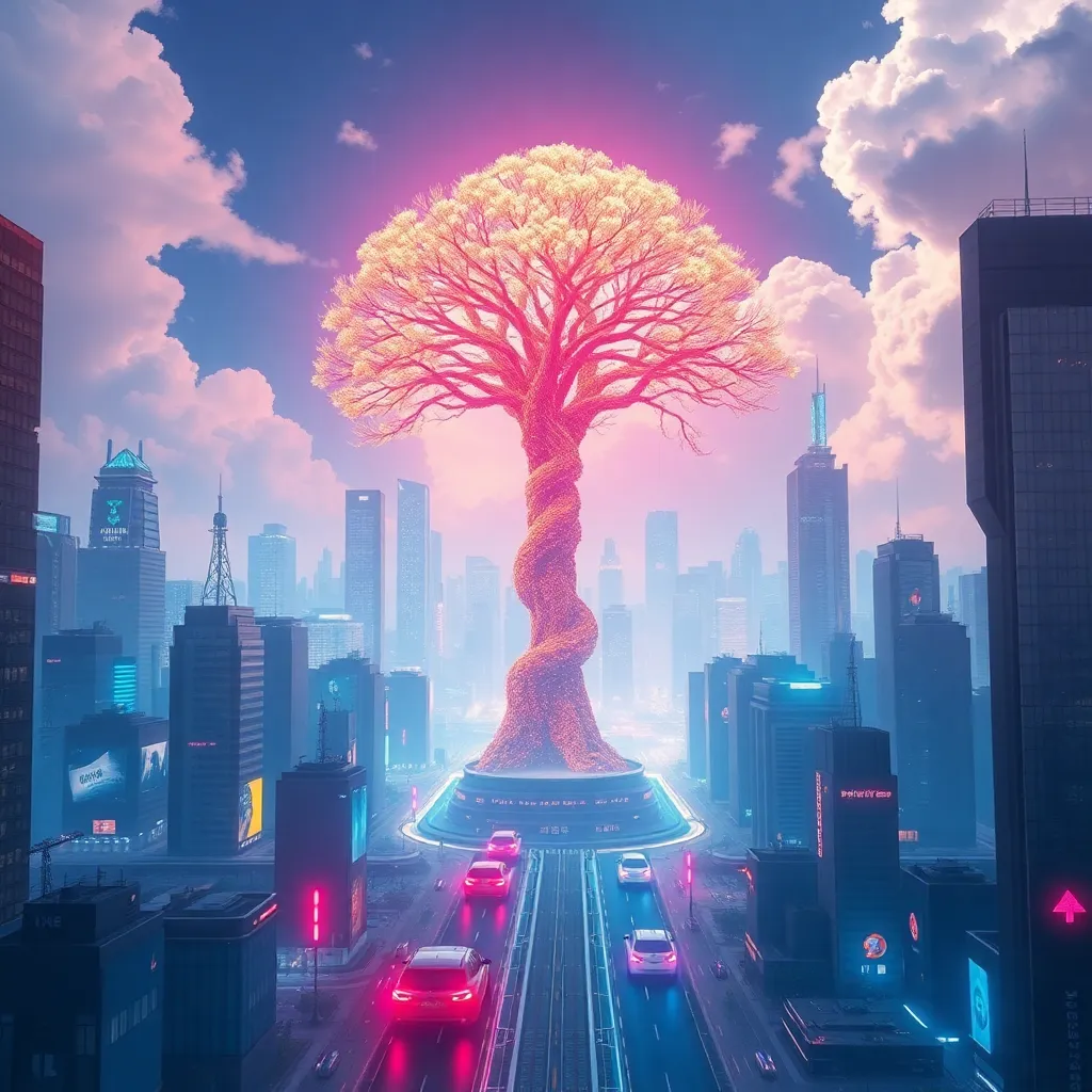 Imagine a futuristic cityscape with towering skyscrapers and flying cars zipping by. In the center, a massive, glowing tree dominates the skyline, its branches reaching up to the clouds. Generate an image that captures the vibrant colors and neon lights of this futuristic metropolis, with a sense of energy and innovation.