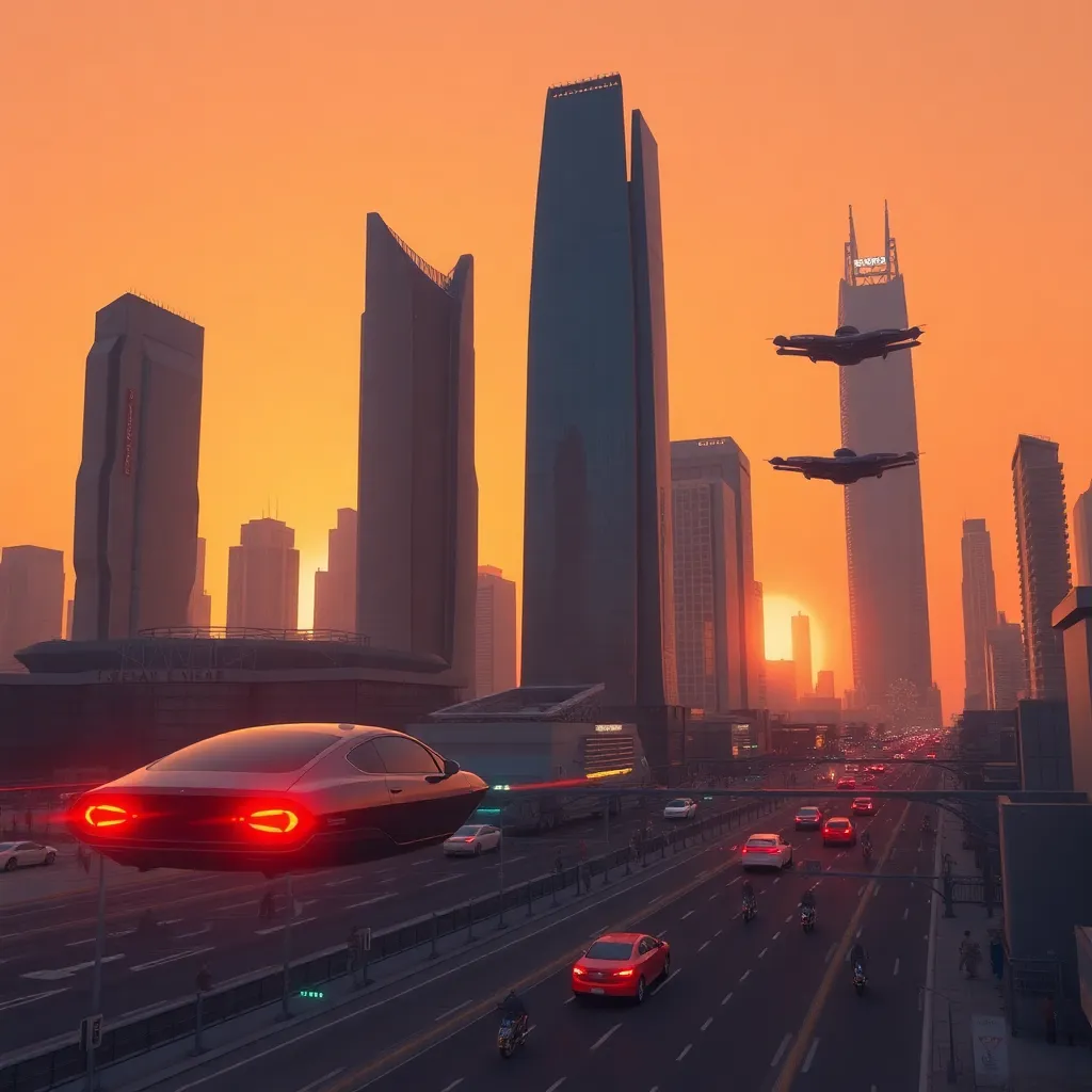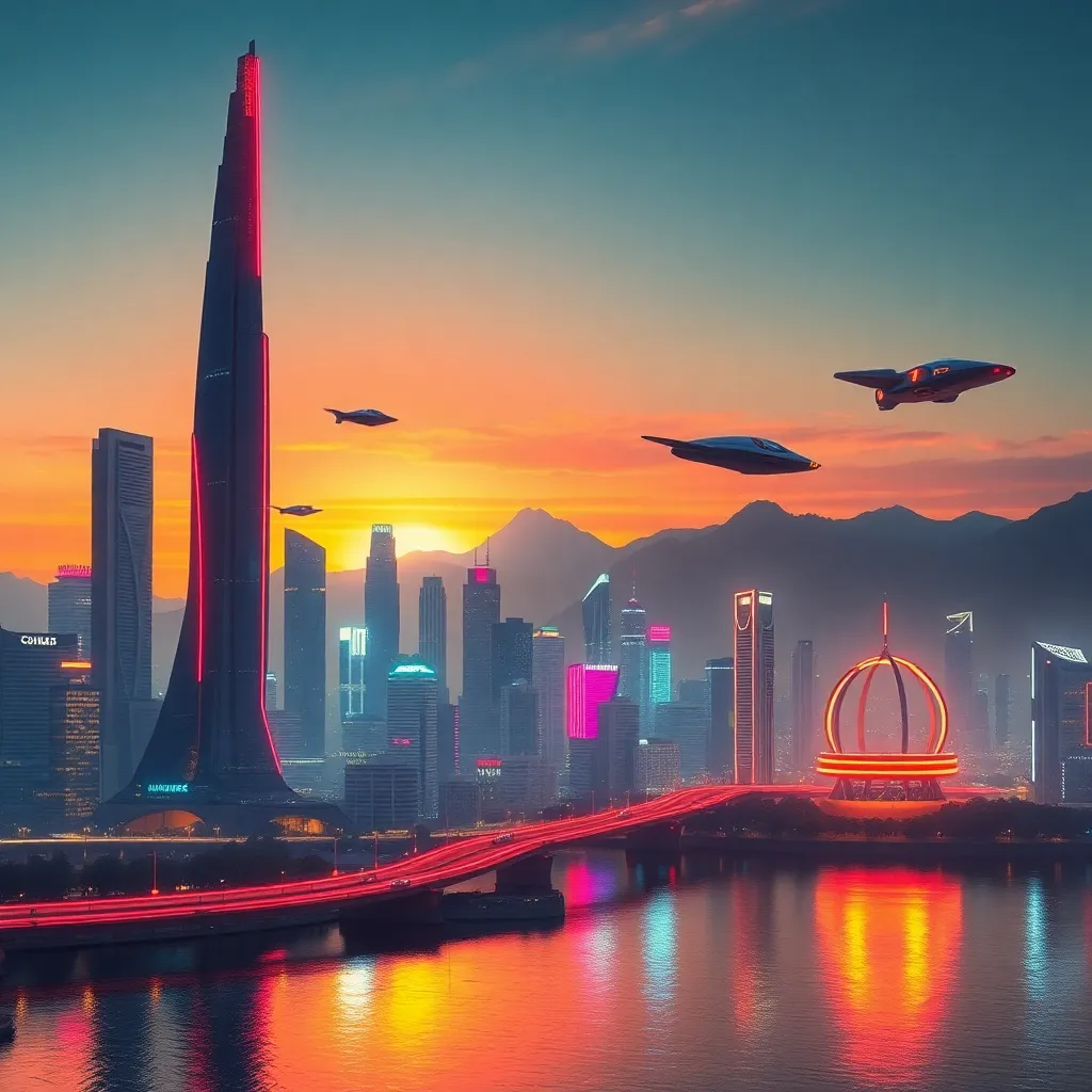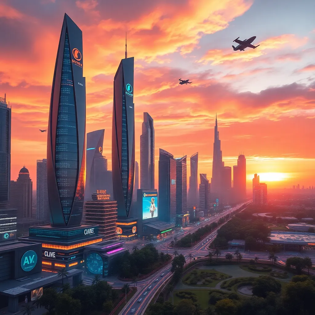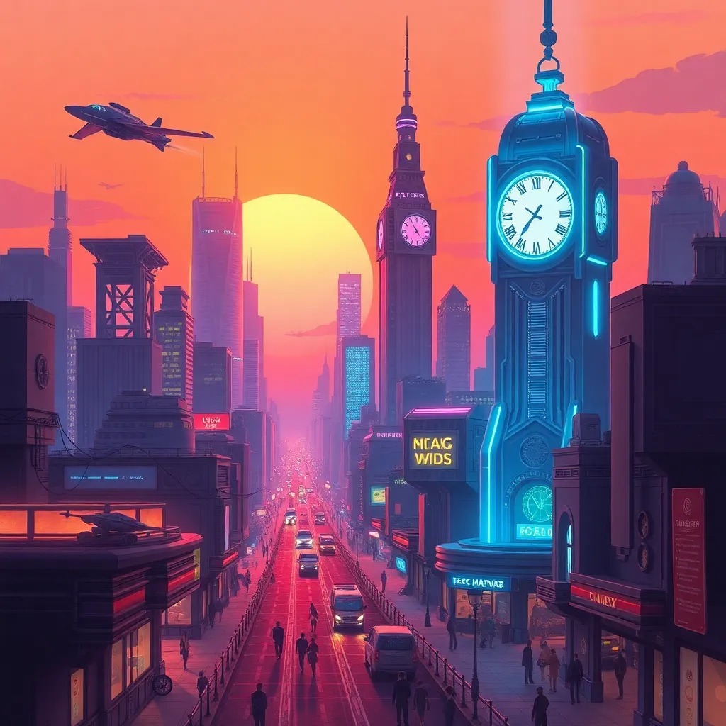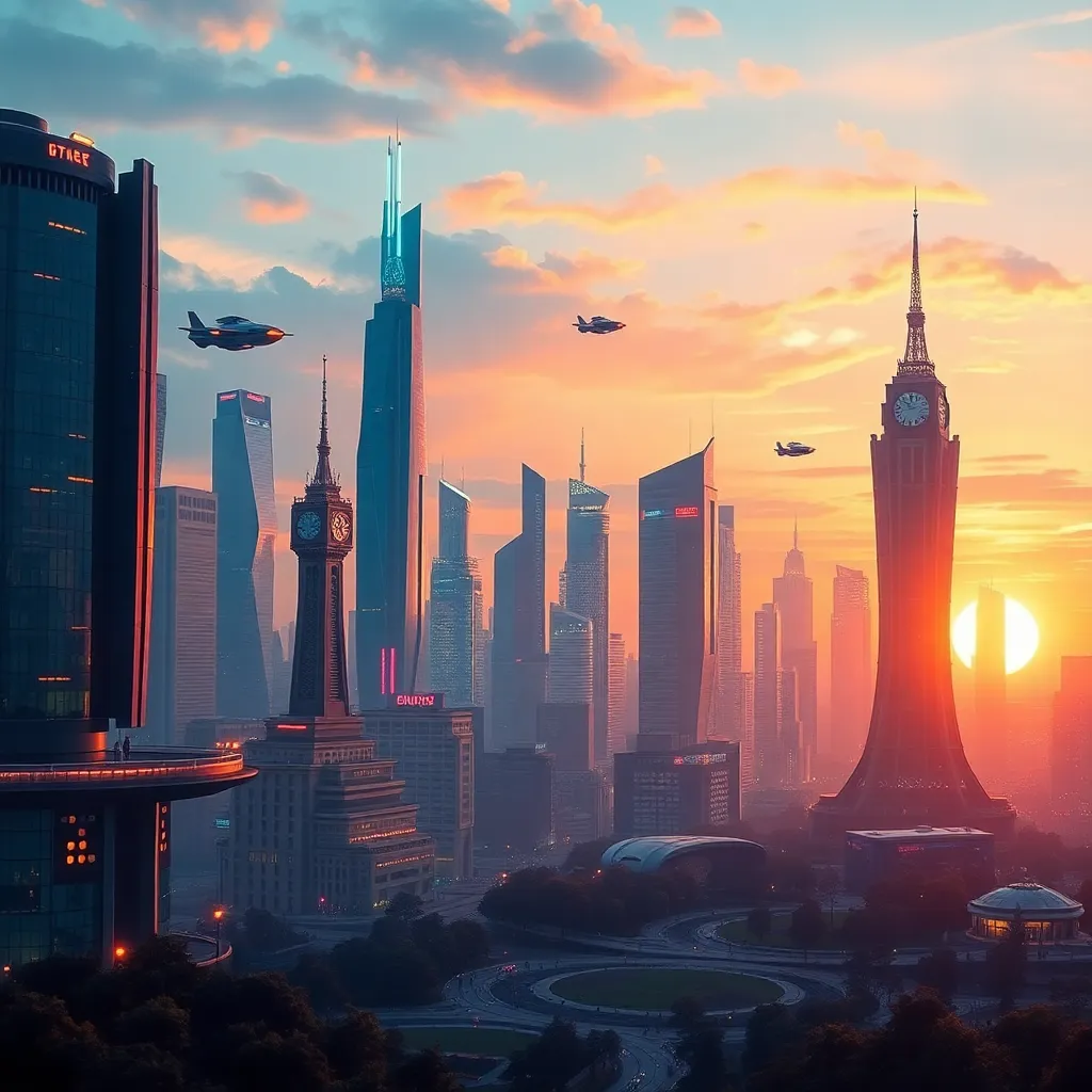 Imagine a futuristic cityscape with a sprawling metropolis, neon-lit skyscrapers, and flying cars zipping by. Create an AI-generated image of this city at sunset, with warm hues and vibrant colors. Incorporate a prominent clock tower and a bustling street scene, capturing the essence of innovation and progress.