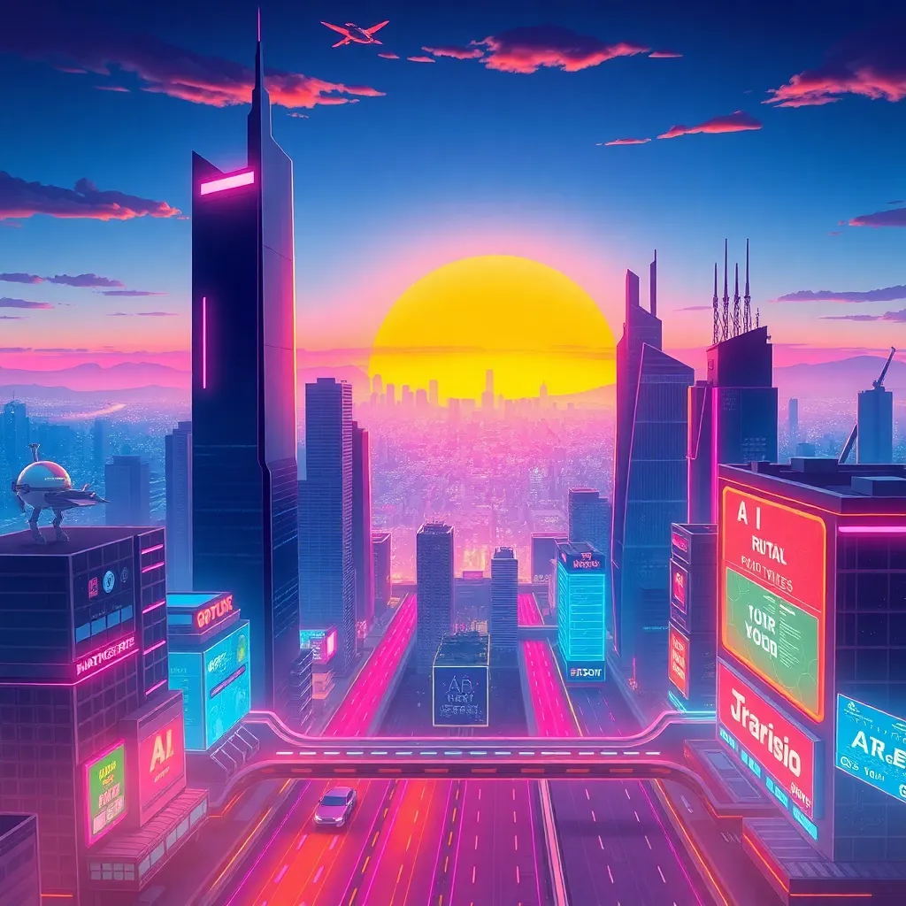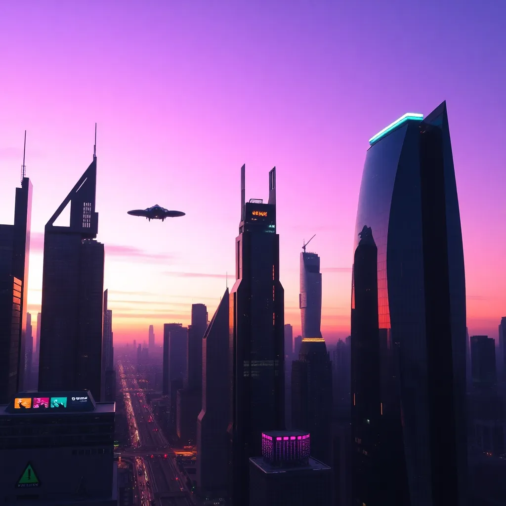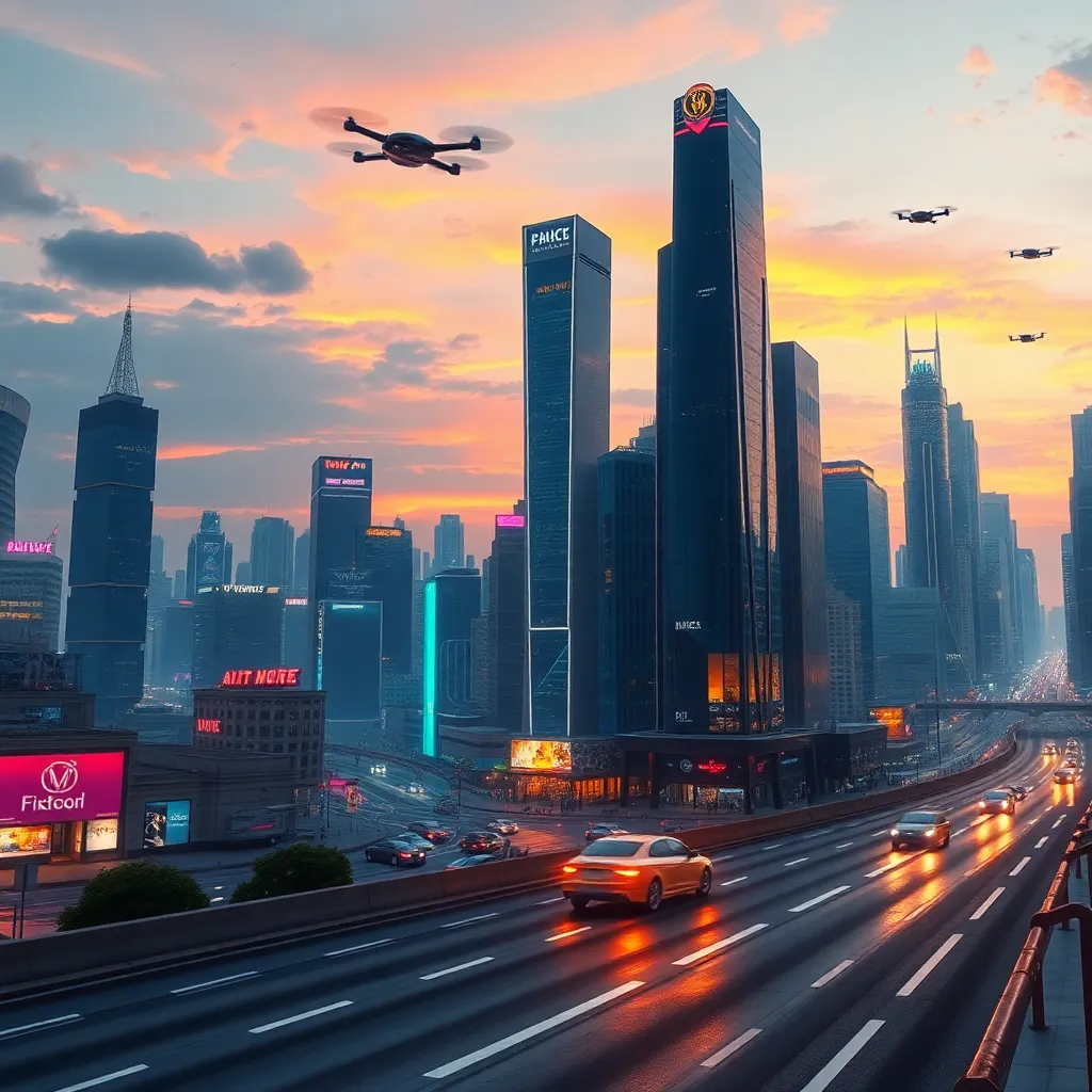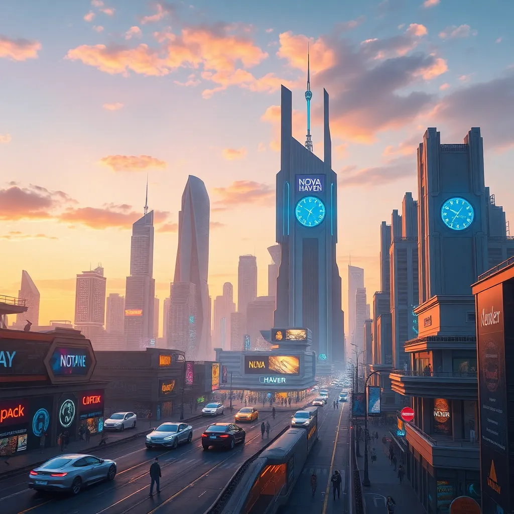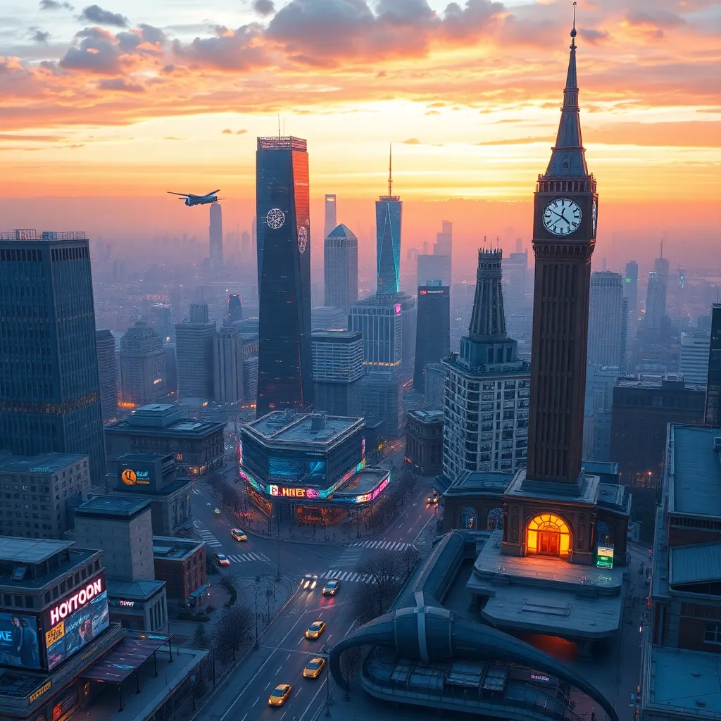 Imagine a futuristic cityscape with a sprawling metropolis, neon-lit skyscrapers, and flying cars zipping by. Create an AI-generated image of this city at sunset, with warm hues and vibrant colors. Incorporate a prominent clock tower and a bustling street scene, capturing the essence of innovation and progress.