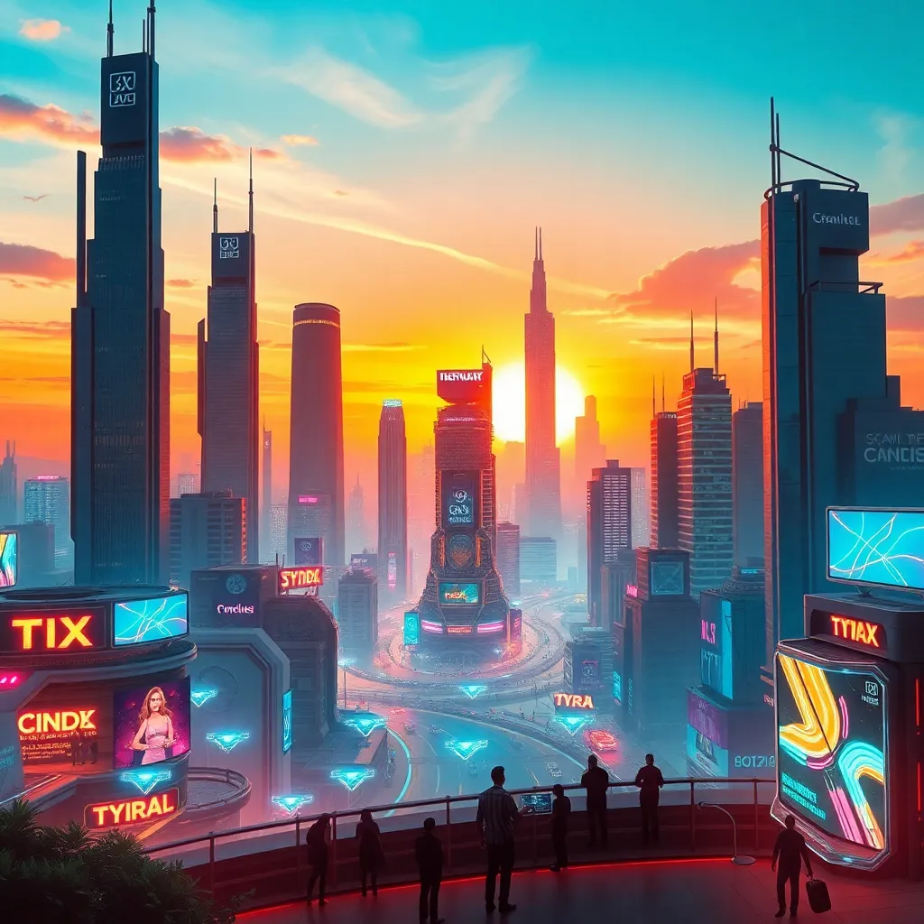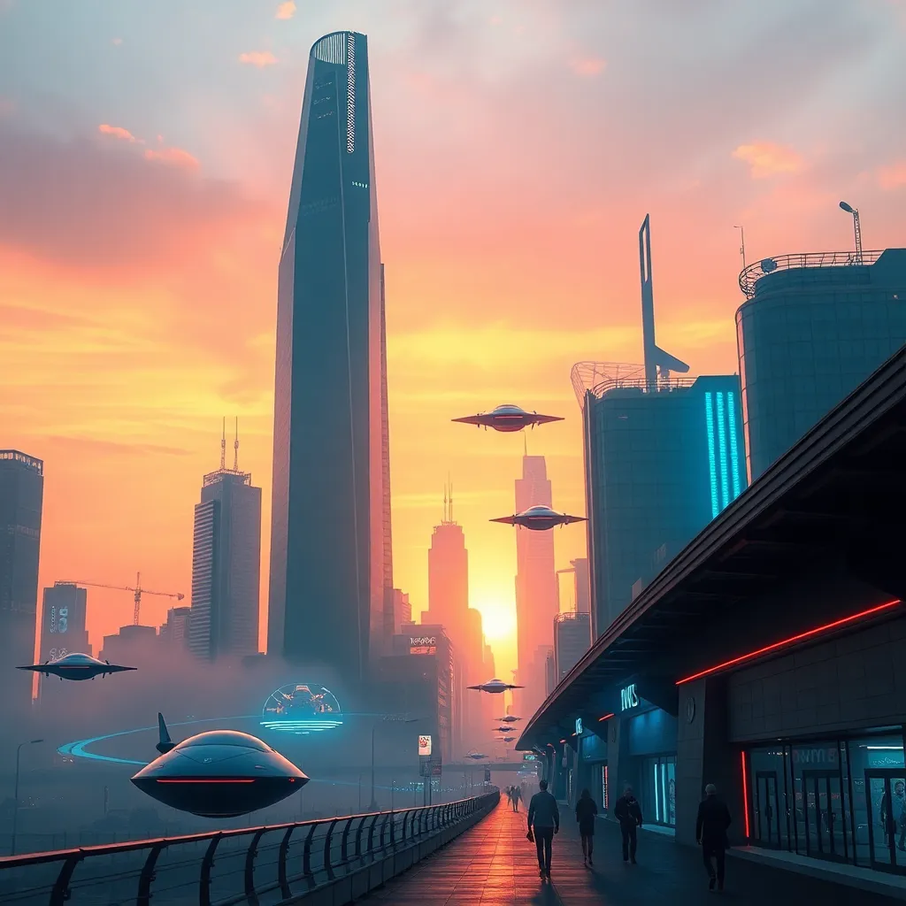 Create an futuristic cityscape at sunset with towering skyscrapers, flying cars, and humans enjoying a day out. Incorporate vibrant colors, neon lights, and a sense of energy and excitement. The city should be surrounded by a futuristic landscape with holographic advertisements and a sense of technological advancement.