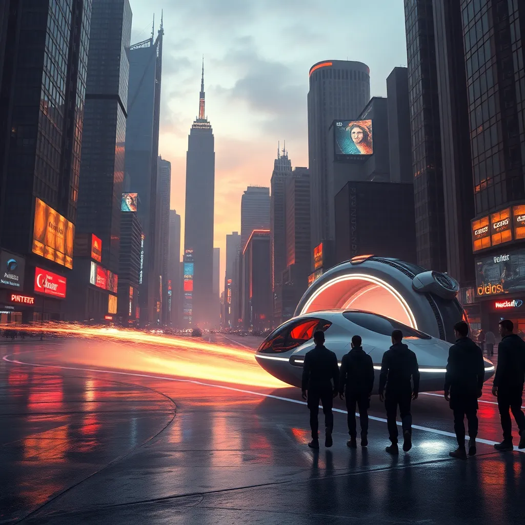 Imagine a futuristic cityscape at dusk, with towering skyscrapers and neon lights reflecting off the wet pavement. A sleek, silver hovercar zooms by, leaving a trail of sparks. In the foreground, a group of humans in futuristic attire walk towards a glowing, cylindrical entrance. What's the city's name and what's happening?