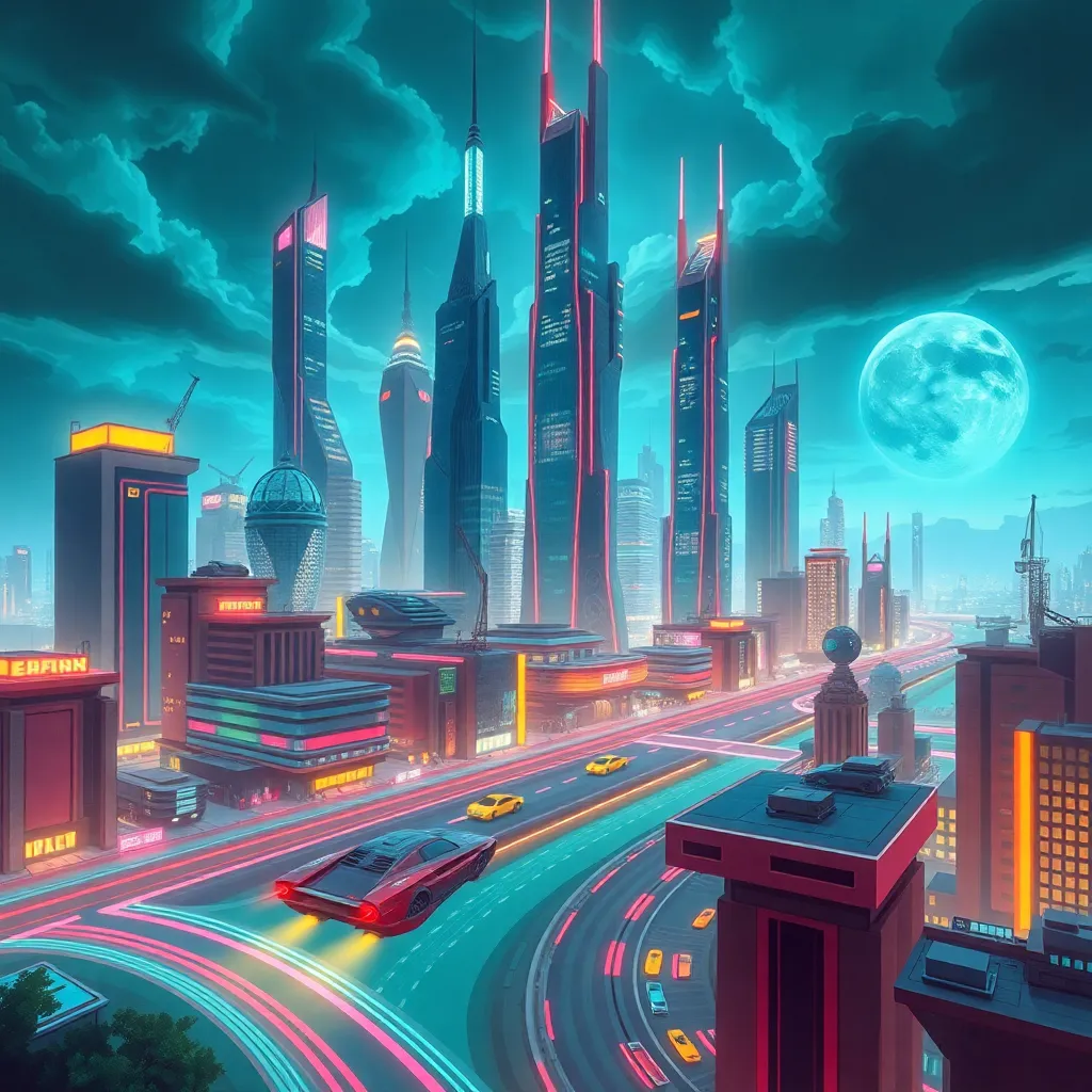 Create a futuristic cityscape with towering skyscrapers, neon lights, and a vibrant atmosphere. Incorporate a sense of movement and energy, with flying cars and robots zipping by. The city should be surrounded by a blue-green glow, representing a sustainable and eco-friendly environment. Use bold colors and geometric shapes to make it pop!