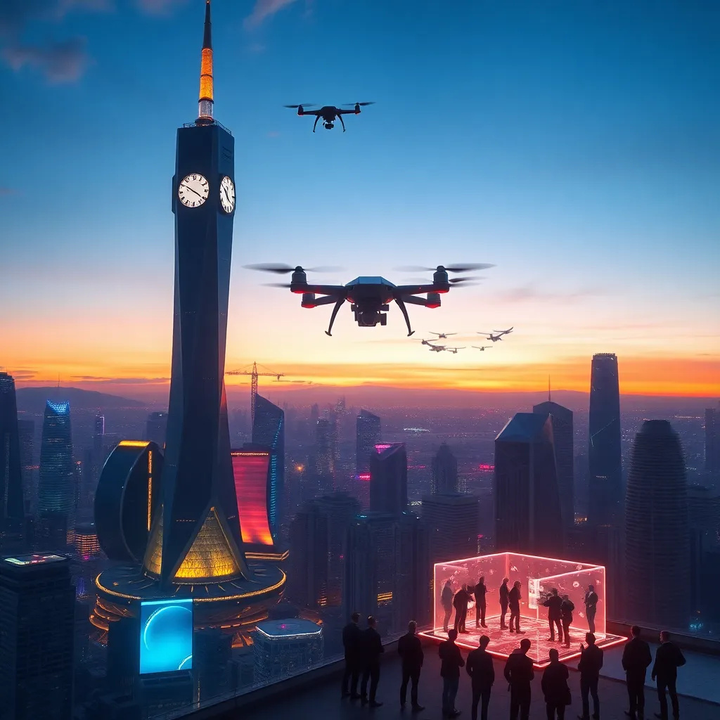 Create a futuristic cityscape at dusk, with sleek skyscrapers, neon lights, and a sprawling metropolis. Incorporate a prominent clock tower, a hovering drone, and a group of people gathered around a holographic display. The atmosphere should be vibrant and futuristic, with a sense of innovation and progress.