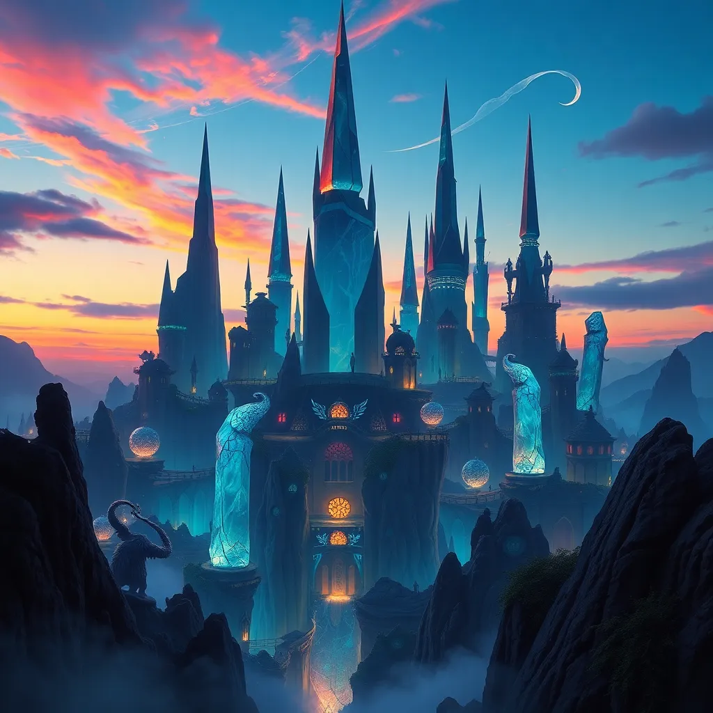 Create an otherworldly cityscape at dusk, with towering crystal spires and iridescent skies. Incorporate glowing, ethereal creatures and wispy clouds. The city's architecture should blend seamlessly with the natural environment, as if it's been grown rather than built. Use a palette of blues and purples to evoke a sense of mystery.