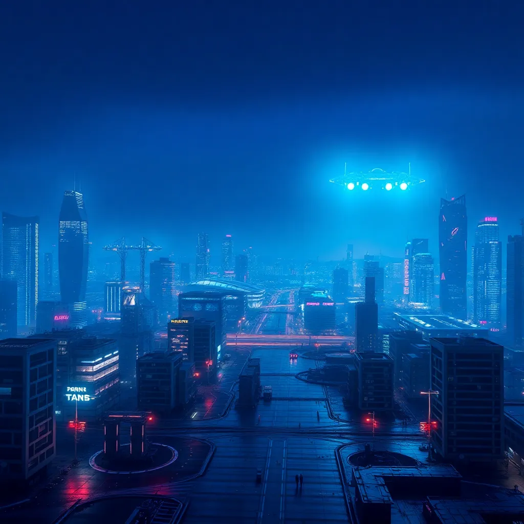 Imagine a futuristic cityscape with a sprawling metropolis and towering skyscrapers. The sky is a deep shade of indigo, with neon lights reflecting off the wet pavement. In the distance, a massive spaceship is landing, its engines glowing with an ethereal blue light. Generate an AI image that captures this scene.